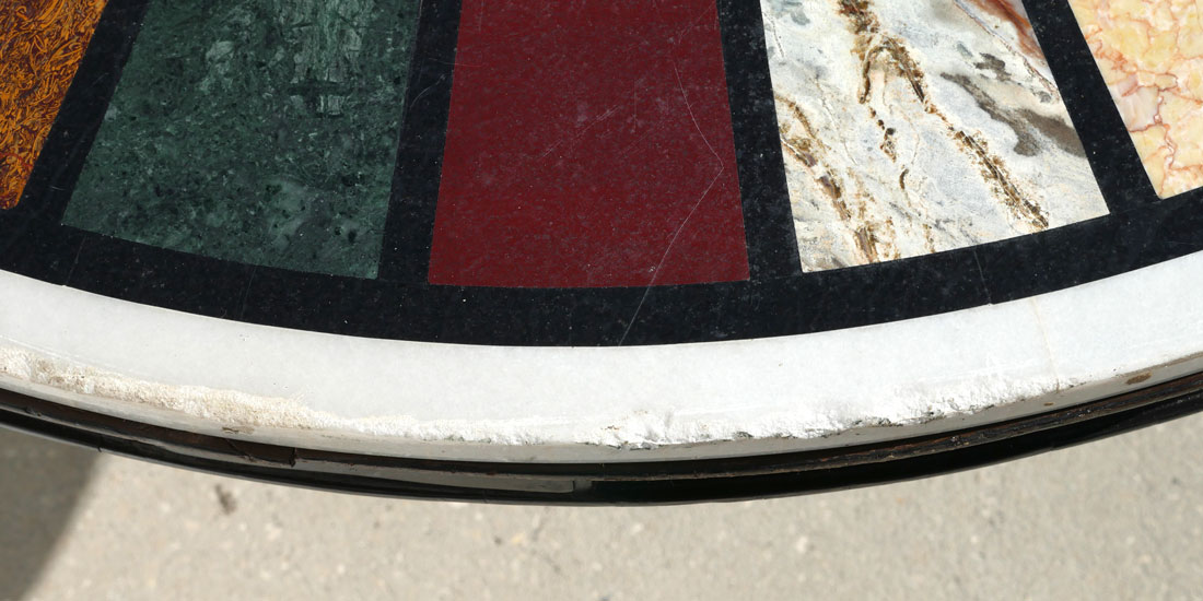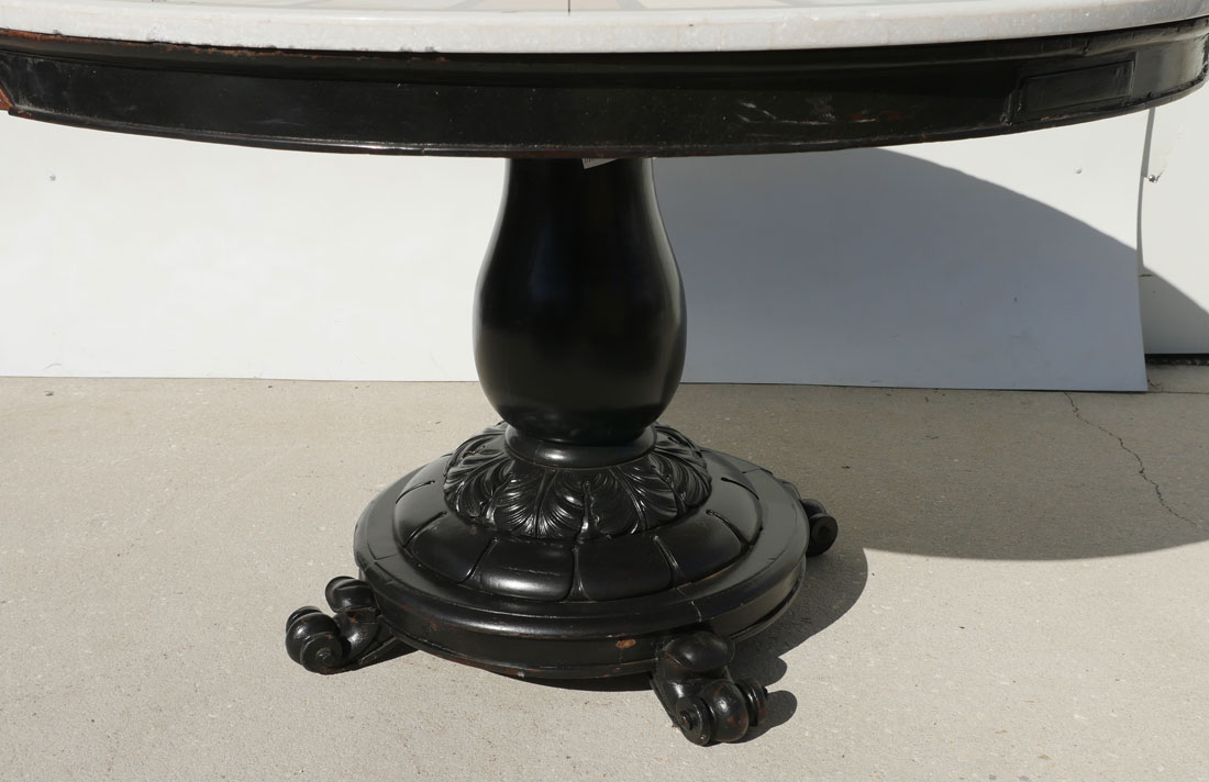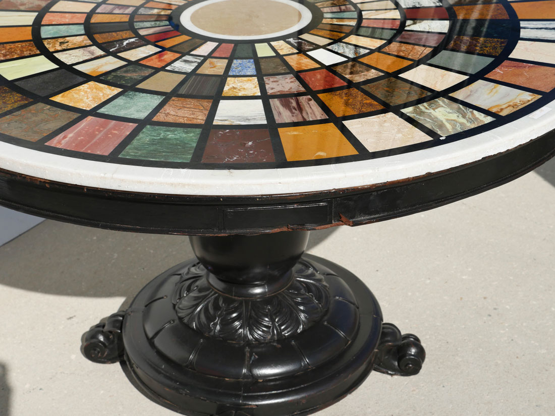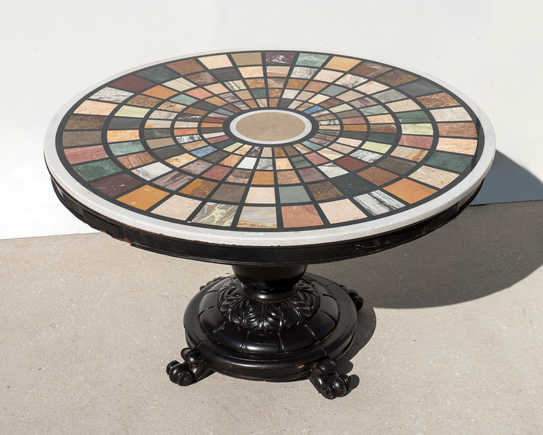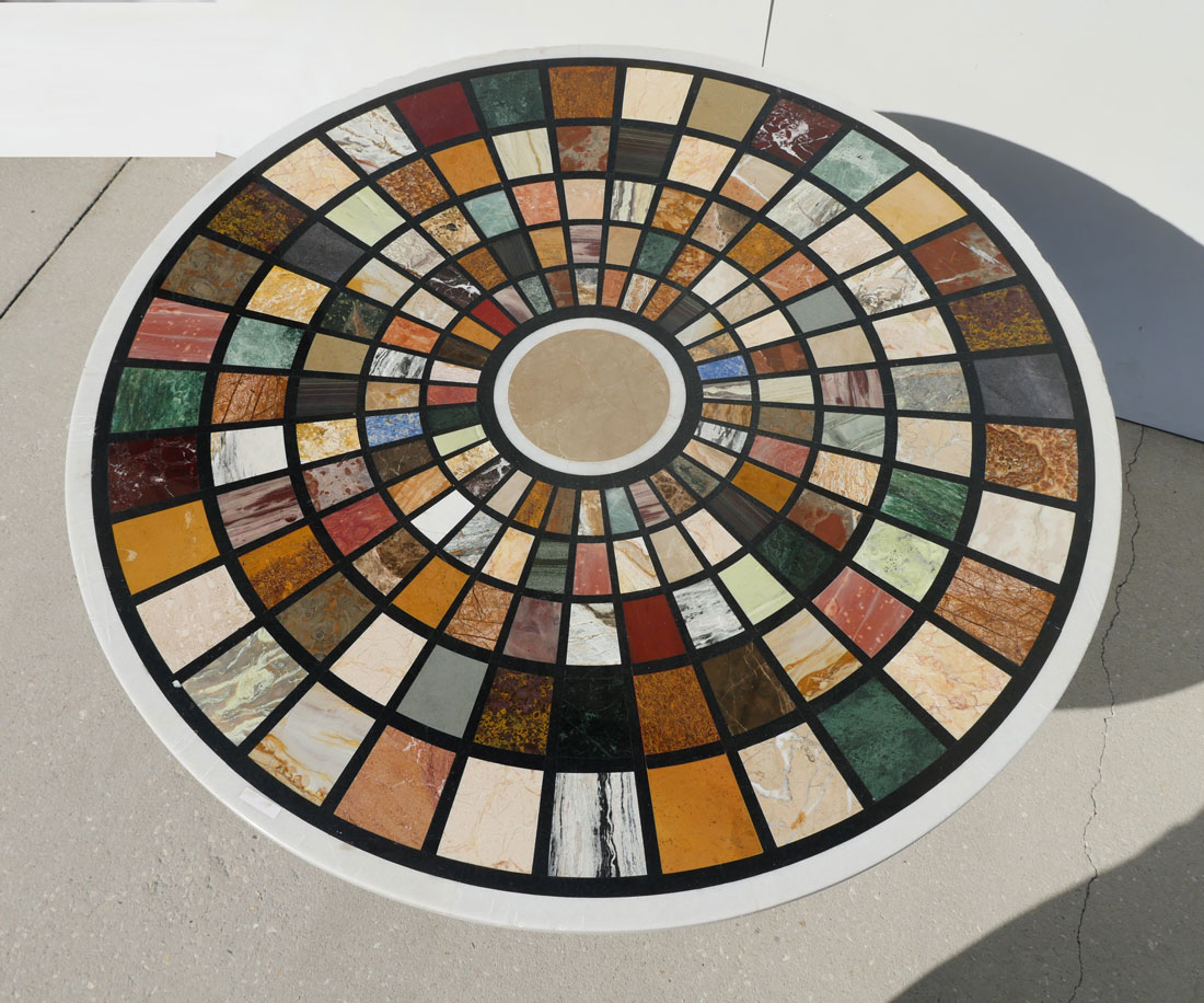INLAID MARBLE TOP SPECIMEN TABLE: Round table top with concentric inlaid rows of assorted marble and stone specimens, 1'' x 48'' dia. Carved wood pedestal base and round wood support ring for top, on 4 feet, 29'' h.x 28'' base dia.