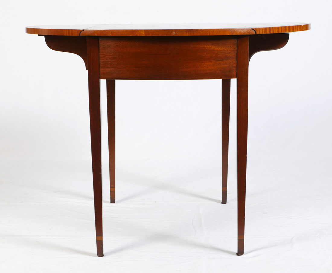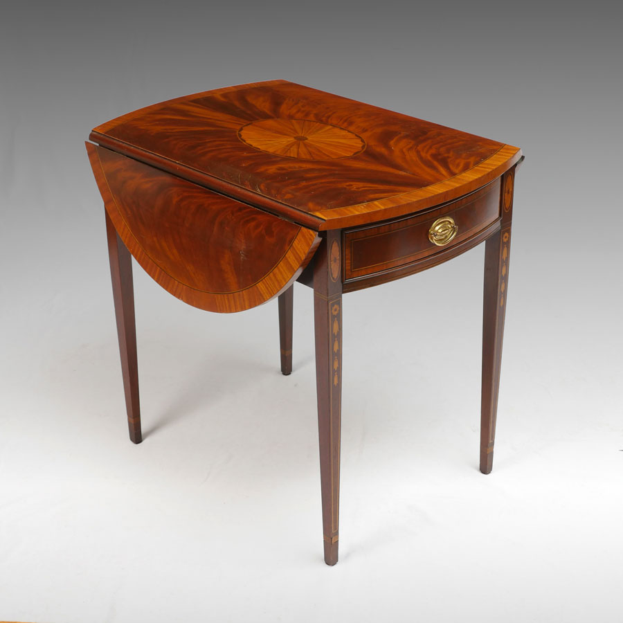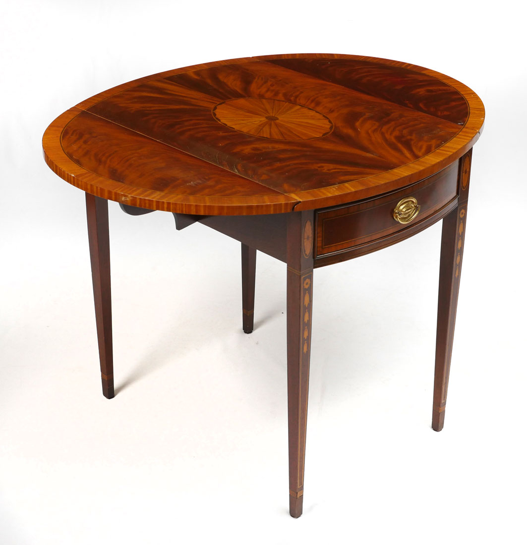COUNCILL FURNITURE INLAID PEMBROKE TABLE: Federal style mahogany pembroke table, parquetry patera inlaid medallion on top over single drawer with brass pull. Tapered legs with bellflowers, 28'' h. x 21'' x 30'', each drop leaf adds 9''.