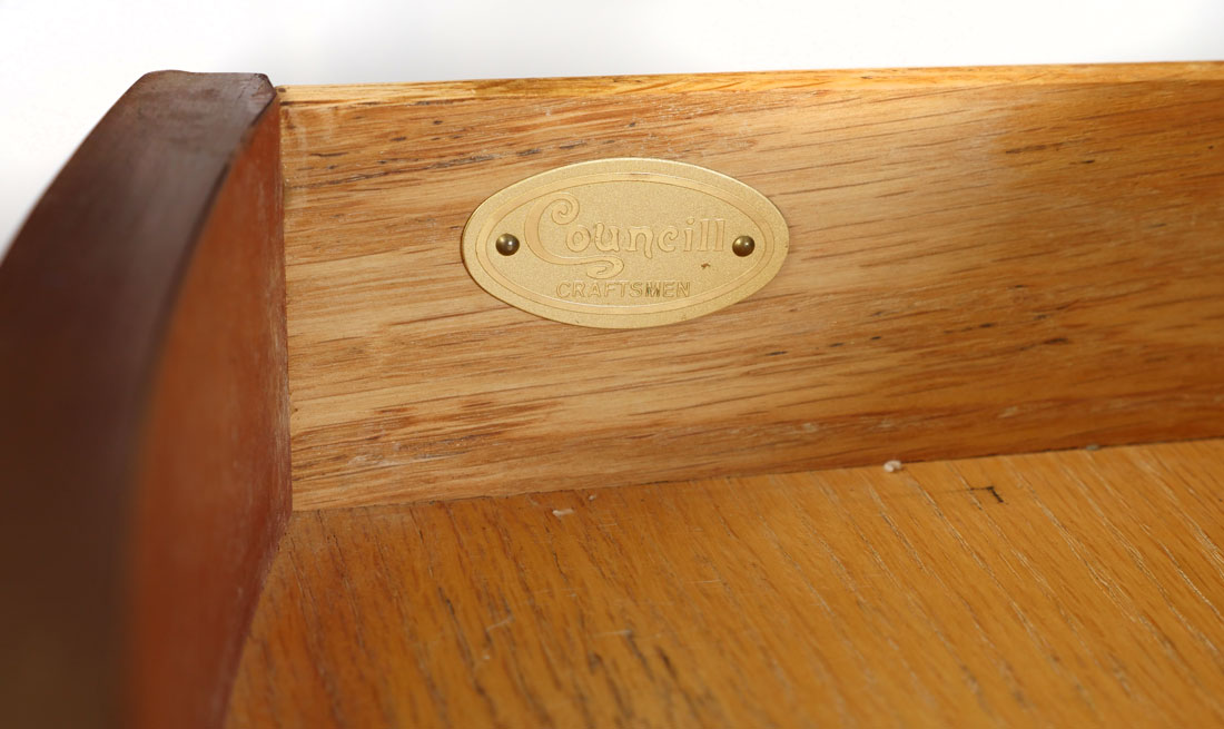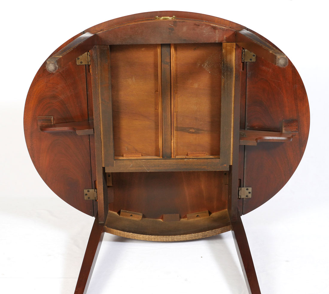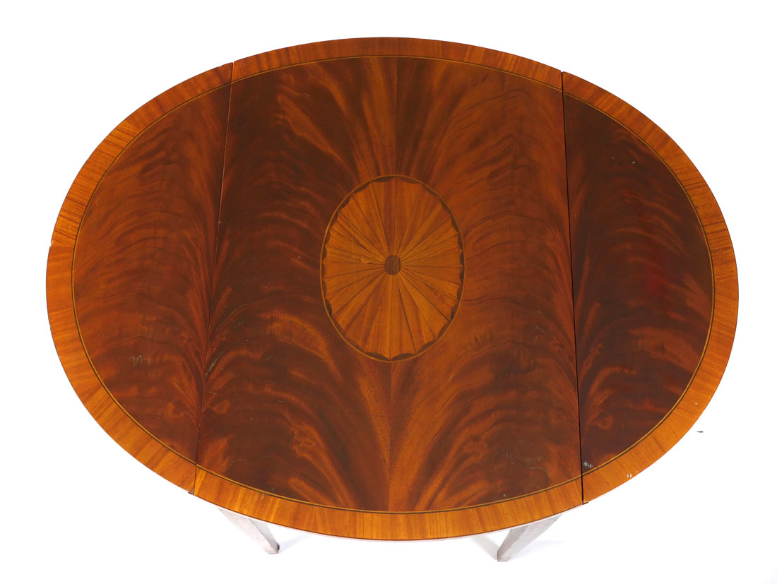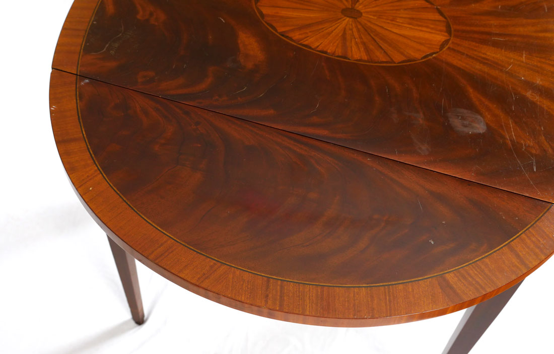 COUNCILL FURNITURE INLAID PEMBROKE TABLE: Federal style mahogany pembroke table, parquetry patera inlaid medallion on top over single drawer with brass pull. Tapered legs with bellflowers, 28'' h. x 21'' x 30'', each drop leaf adds 9''.