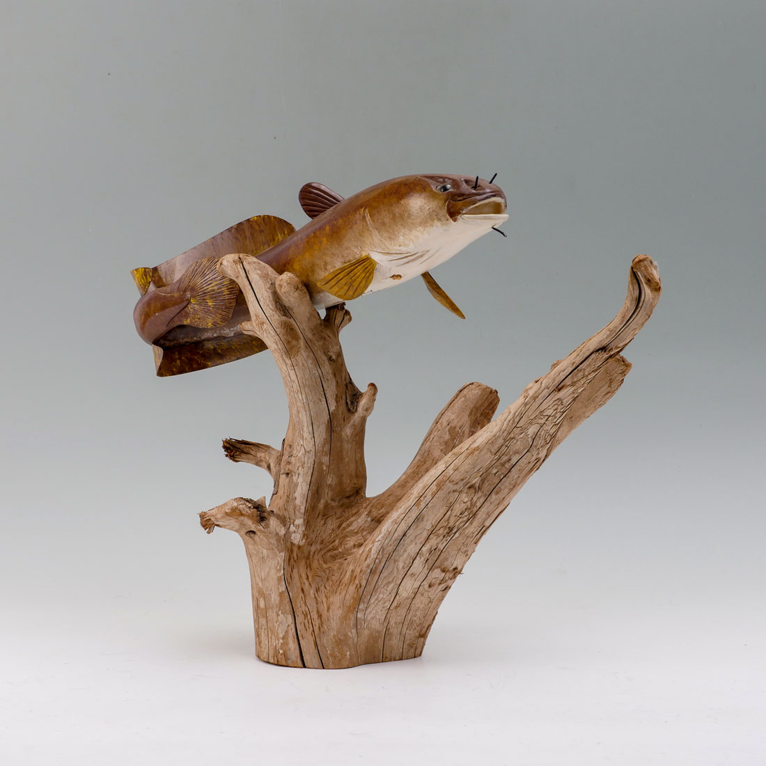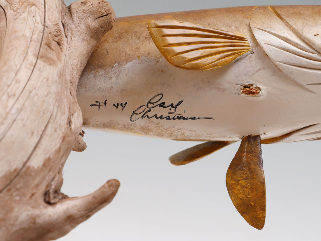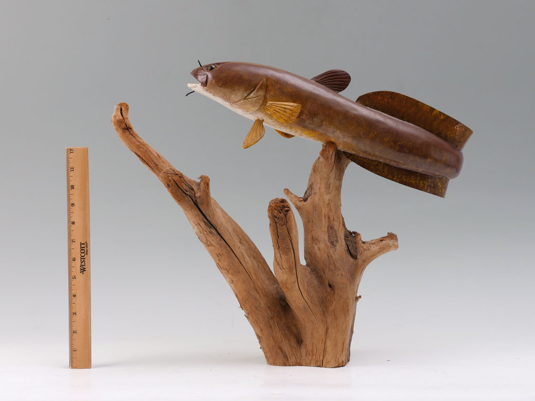 CARL CHRISTIANSEN AMERICAN BURBOT FISH CARVING: Well executed carved and painted figure of a American Burbot affixed to drift wood. Signed and numbered #44 under fish. 17'' h. x 21 1/2''.