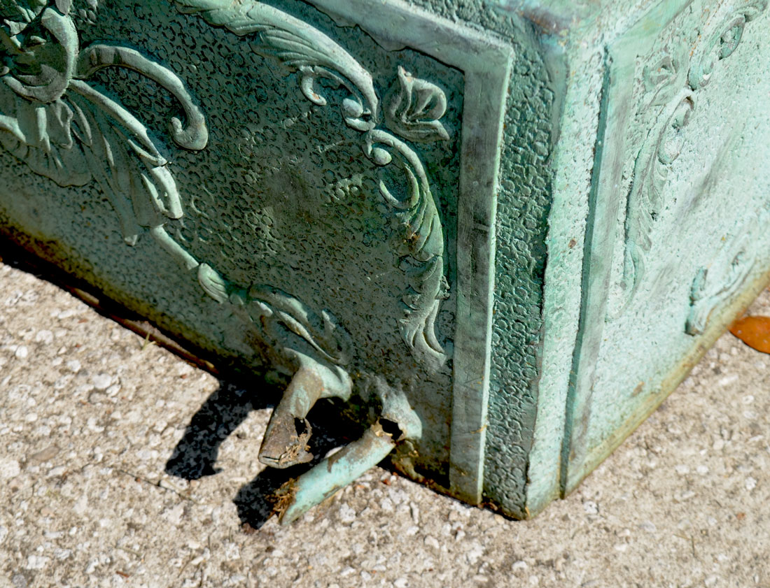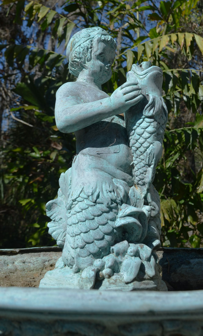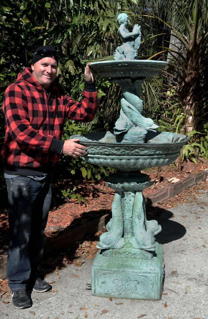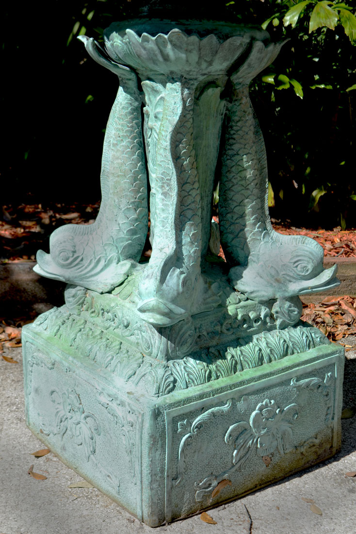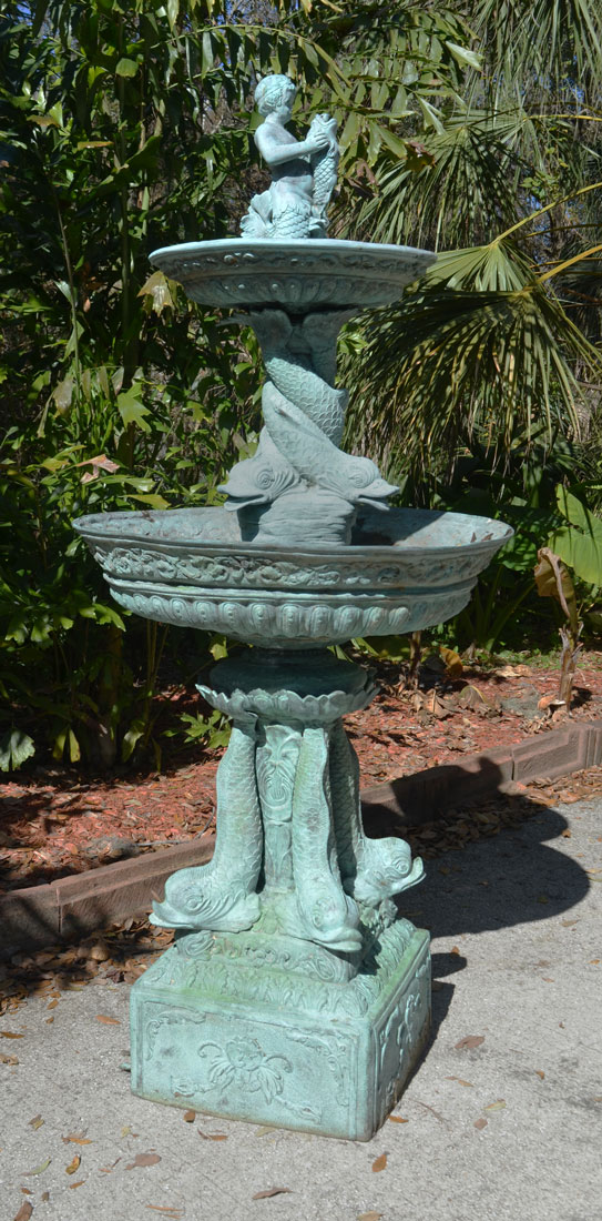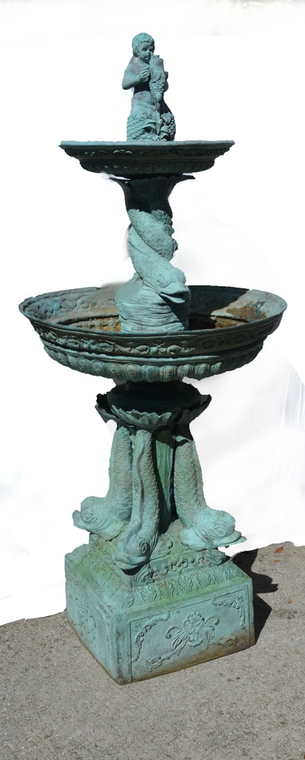 TALL CAST FIGURAL BRONZE OUTDOOR FOUNTAIN: 2 tier fountain, top finial with figural boy merman and dolphin spout, center with 3 figural dolphins, base with 4 dolphins over embossed foliate motif square, overall approx. 77'' h. x 33'' dia. No pump.