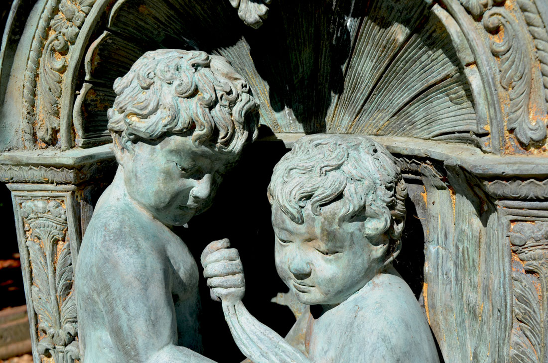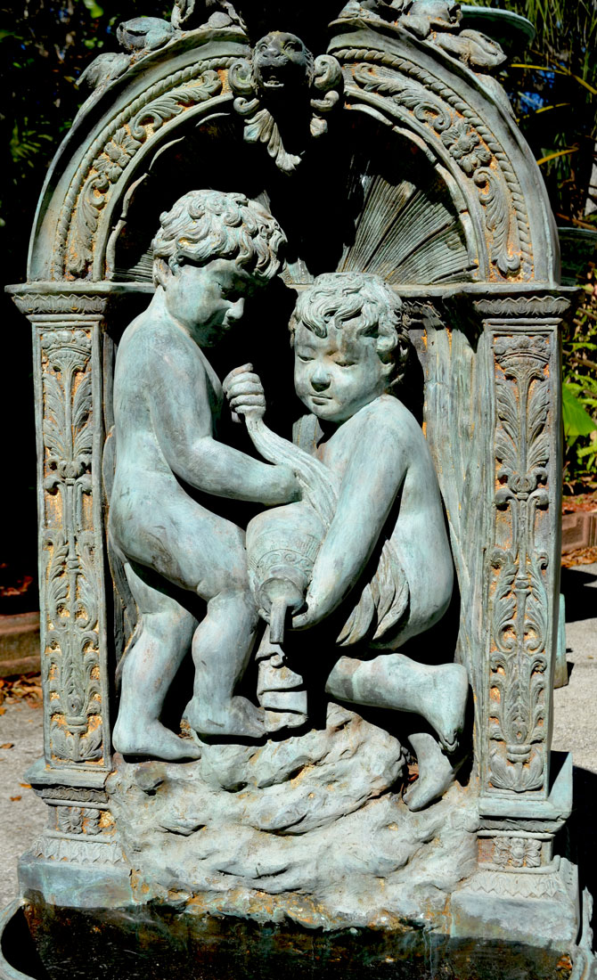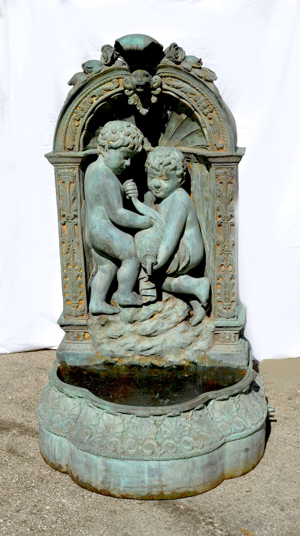 FIGURAL CAST BRONZE WALL FOUNTAIN: Shell and foliate crest over masqueron, center with 2 figural putti and urn spout, reservoir base, overall 47'' h. x 27'' x 21''.