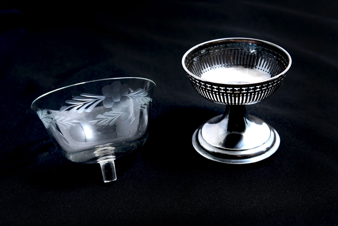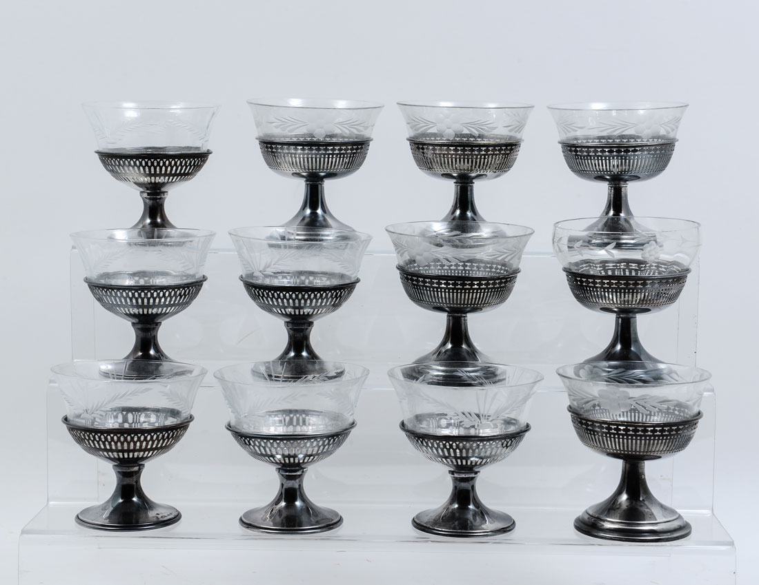 12 STERLING RETICULATED SHERBETS: 12 sherbets total, 6 with reticulated sterling bases by Dominick & Haff, the other 6 unmarked as to maker, cut glass inserts. 2 different size bases, taller measures overall with inserts 3 5/8'' h. x 3 1/2''. Approx. 15.0 troy oz.