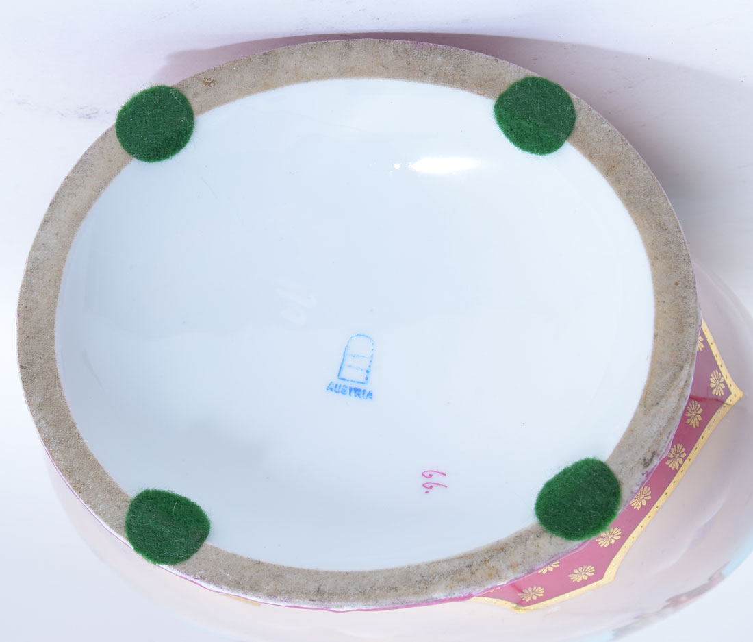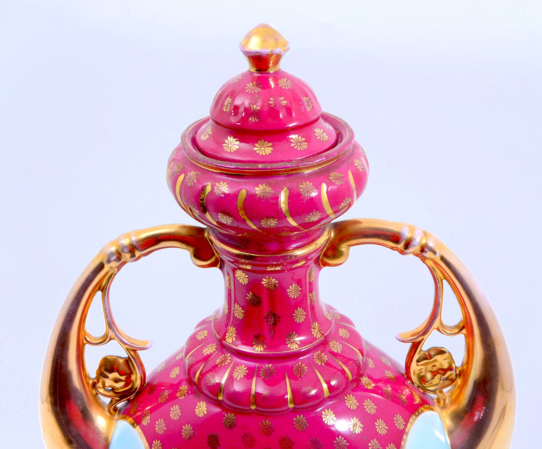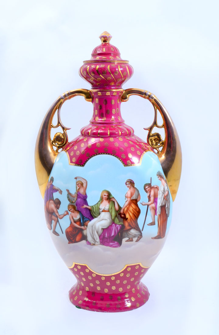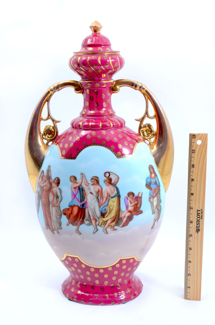 ROYAL VIENNA HAND PAINTED COVERED URN: Maroon field top and bottom with gilt floral accents, gilt decorated handles, center with hand painted neo-classical maidens dancing on one side, seated woman with attendants other side. Blue beehive and Austria mark, 19 3/4'' h. x 11''.