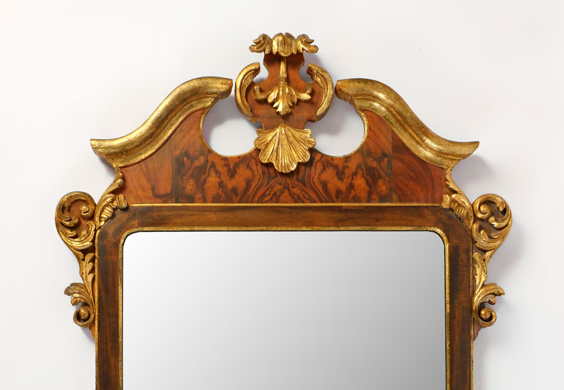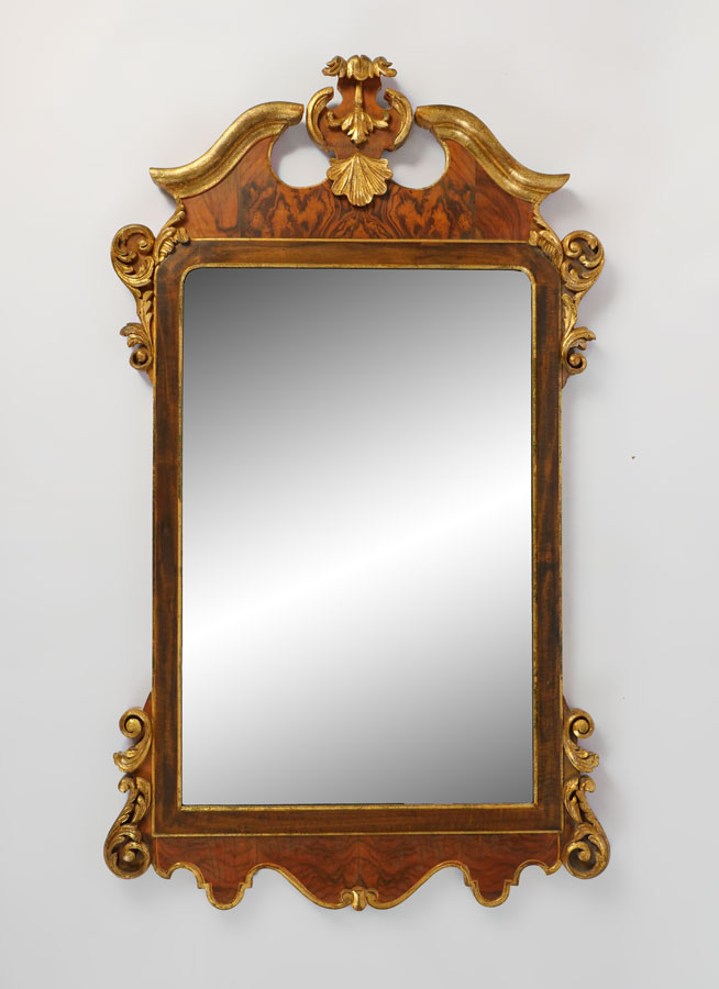 LA BARGE ROCOCO STYLE BURL & GILT MIRROR: Composite frame with burl wood veneer and gilt accents to molded decoration, LaBarge tags on back, overall 48 1/2'' h. x 28'' x 2''.