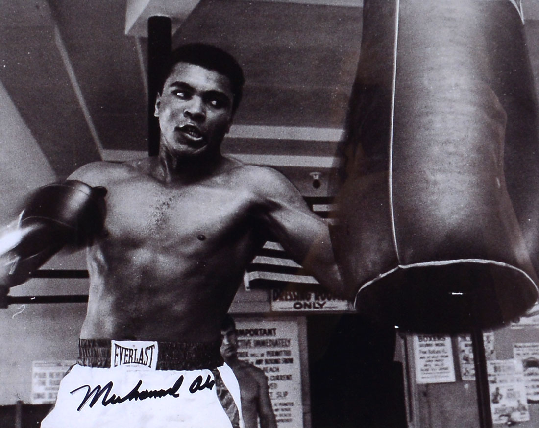 ''Ali Punching Bag, South Beach Miami 5th St. Gym'', hand signed photograph in black and white, sight size is 8'' x 10'', signed in black ink.