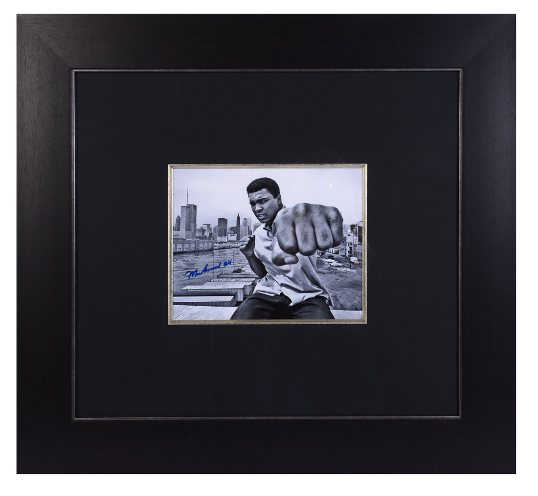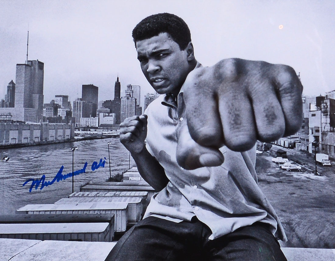 ''Ali on Rooftop Punching'', hand signed photograph in black and white, sight size is 8'' x 10'', signed in blue ink.