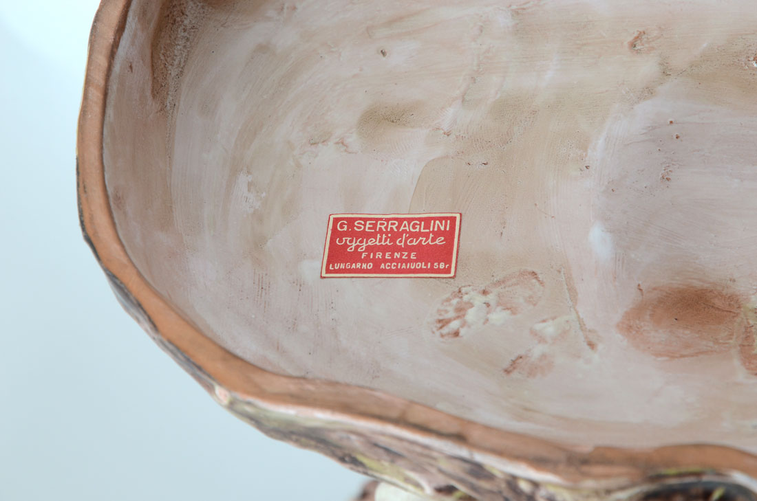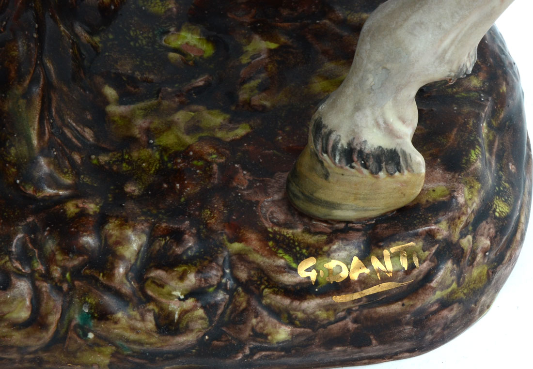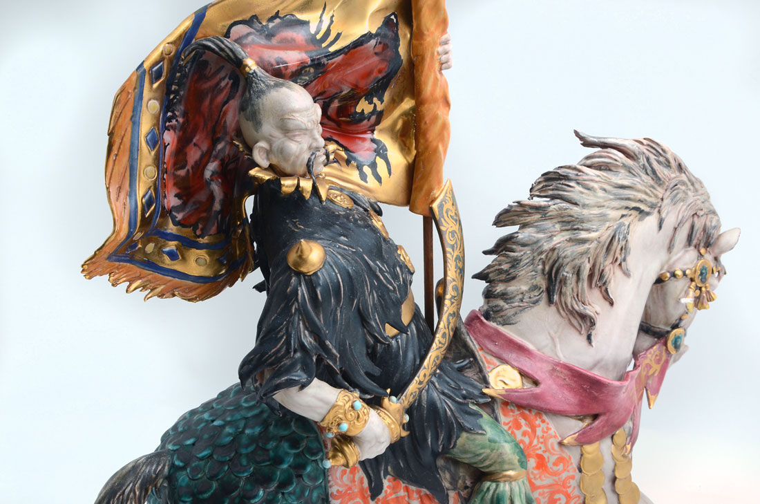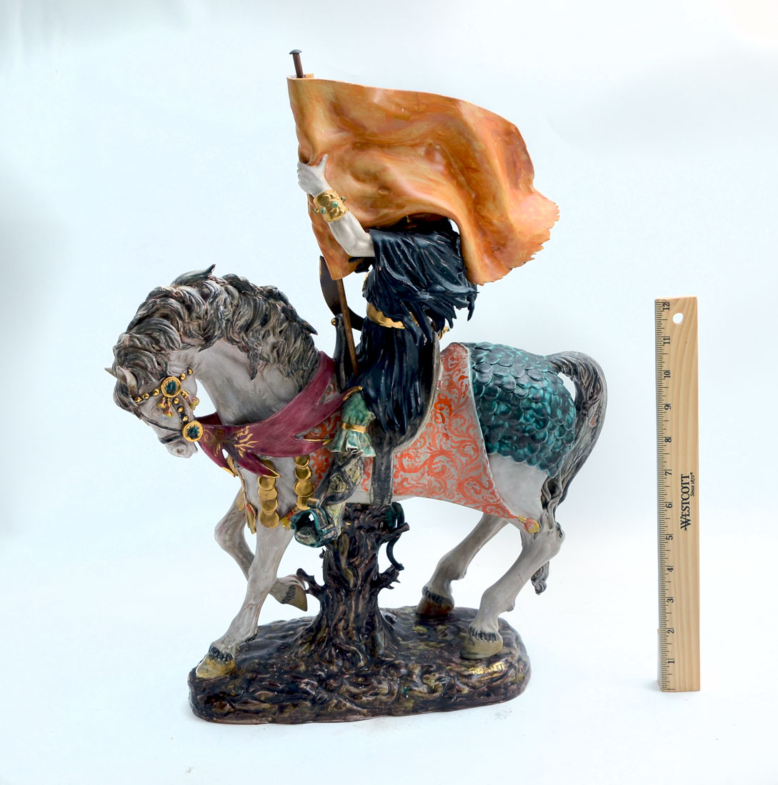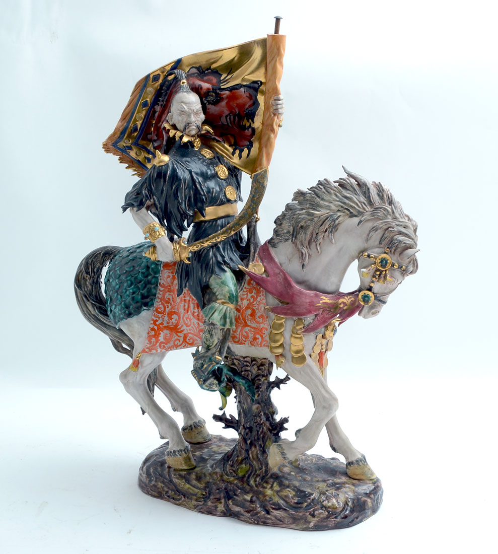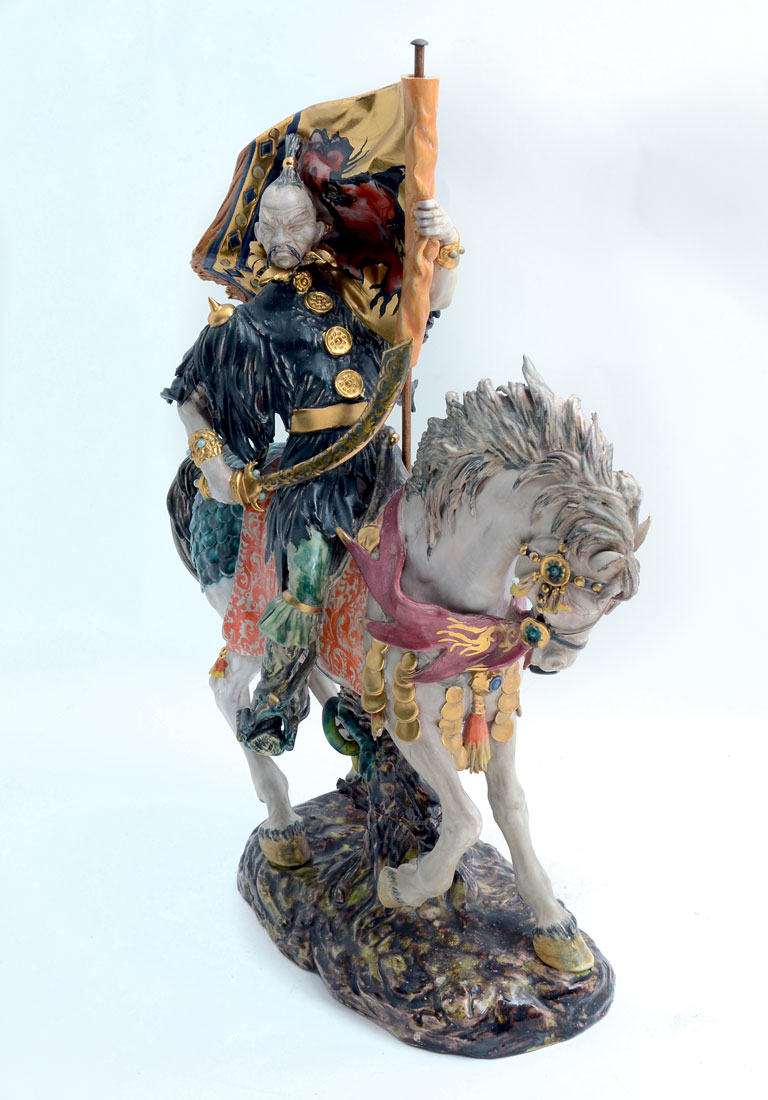 G. SERRAGLINI PORCELAIN CHINESE SOLDIER SCULPTURE: Italian porcelain figure of a Chinese soldier on horseback, flag flying and sword unsheathed. Hand polychrome painted, signed by the artist G. Danti. Original G. Serraglini, Firenze label on base, overall measures 20'' h. x 15'' x 7 1/2''.