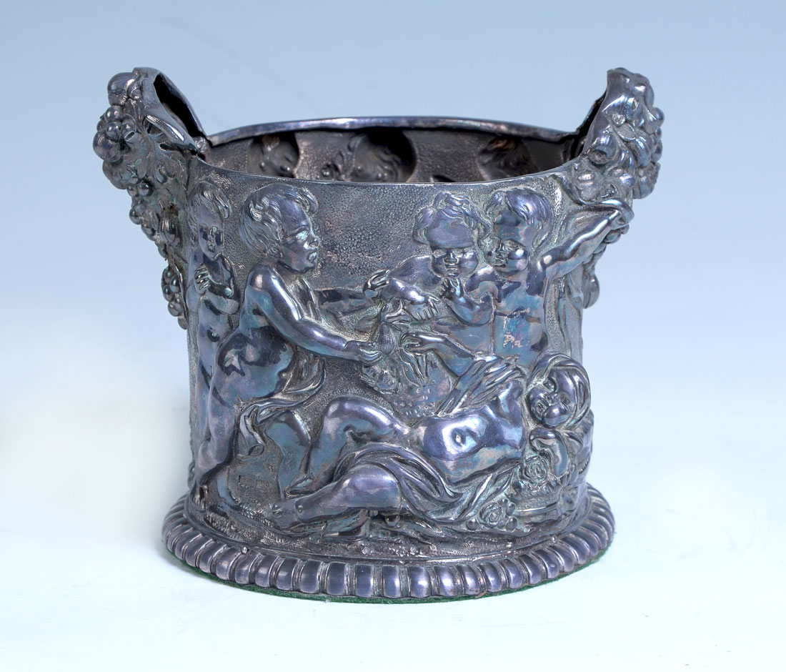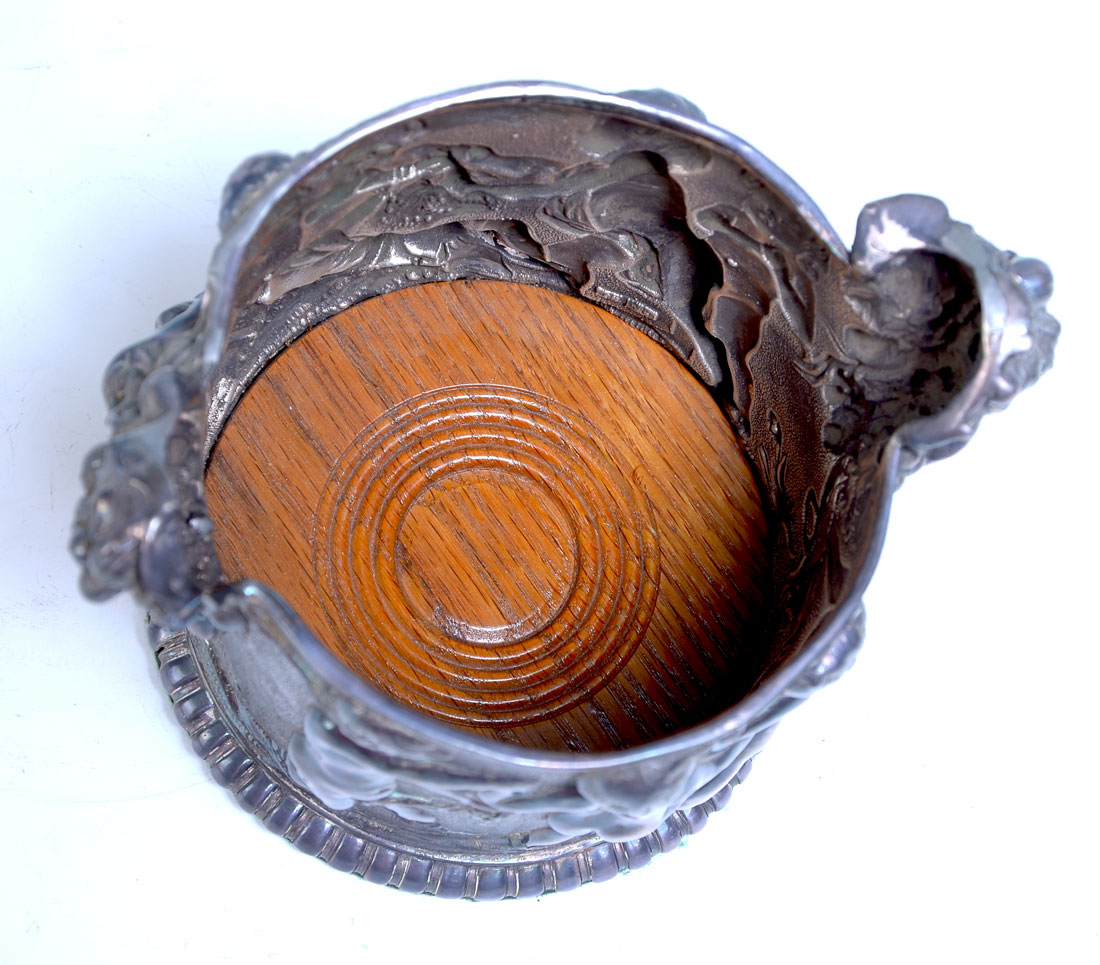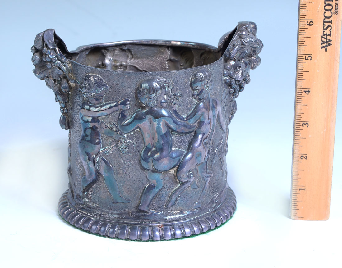 FIGURAL EMBOSSED STERLING SILVER WINE COASTER: Embossed Bacchian scene with putti and pan figures, wood base, stamped .925 and illegible makers mark. Overall 6'' h. x 7''.