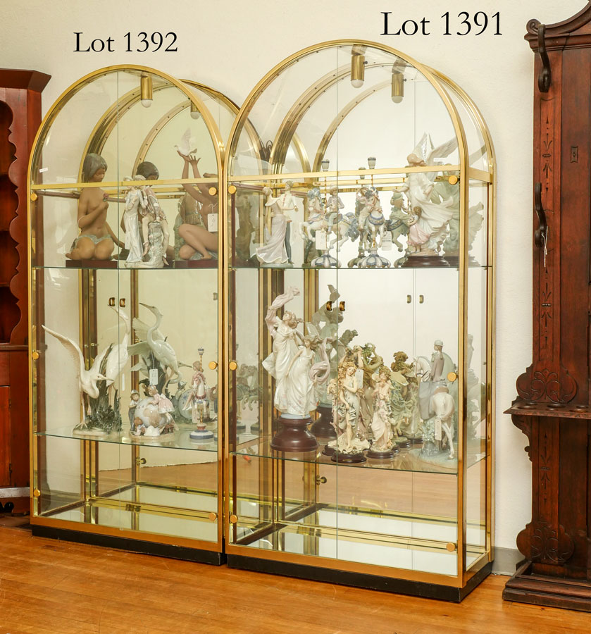 BRASS & GLASS DISPLAY CABINET: Arched top, illuminated interior, mirrored back, glass shelves. Overall 78'' h. x 37 1/2'' x 16''. For matched pair see next lot.