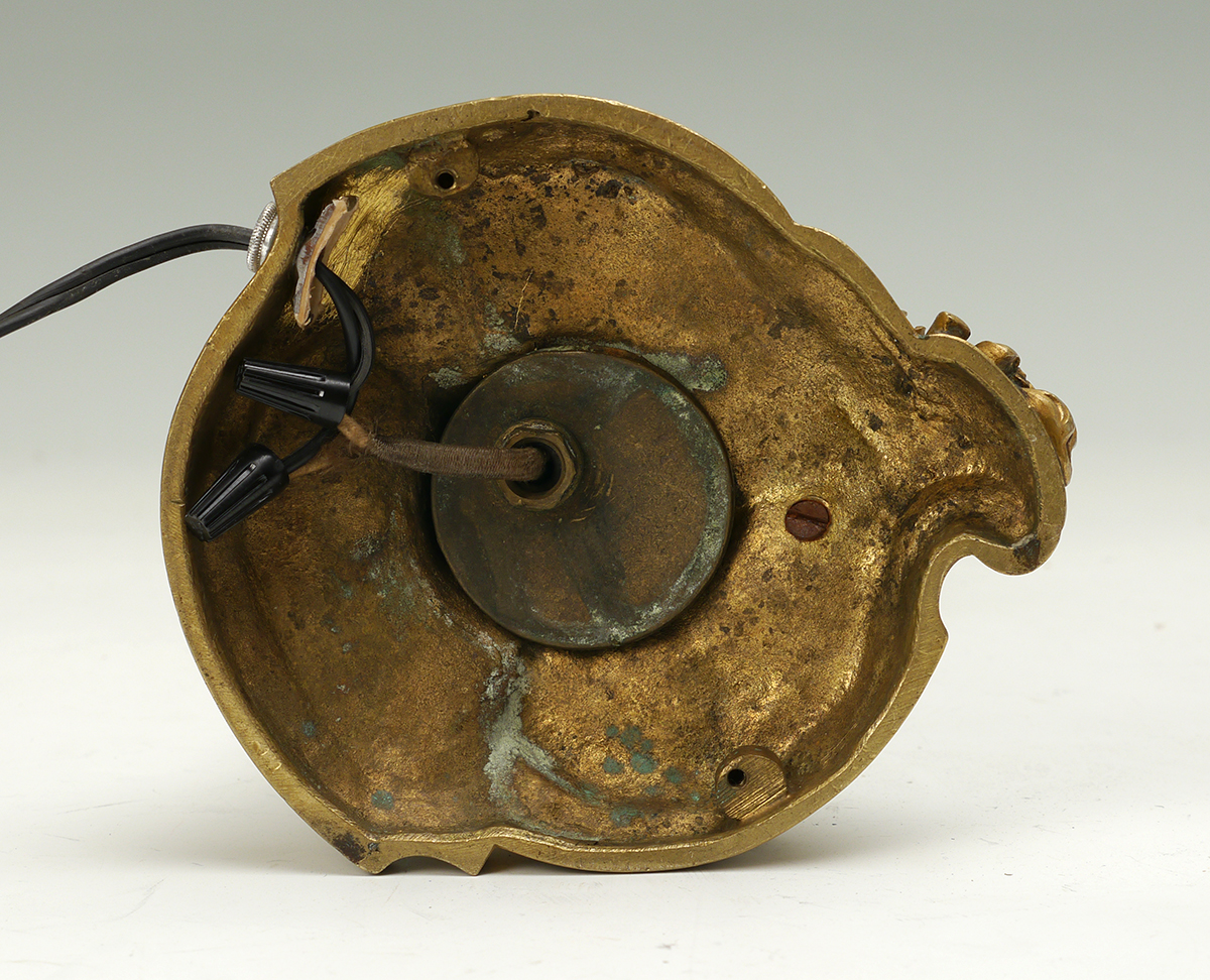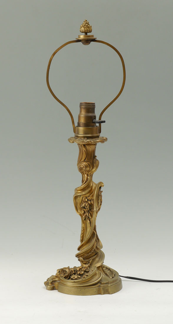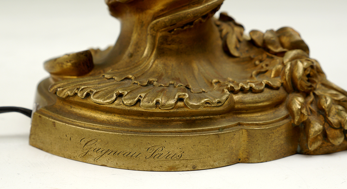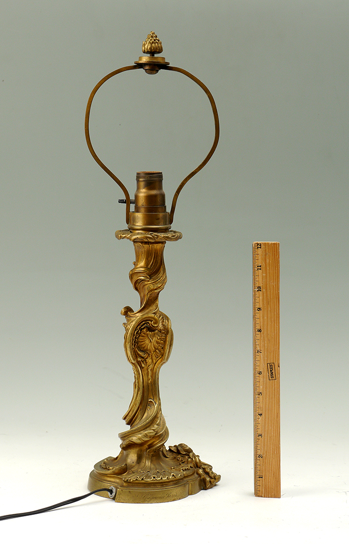 GAGNEAU FRENCH GILT BRONZE LAMP: Early 20th century, rococo style foliate scroll design, heavy case gilt bronze, single socket fixture, signed on base Gagneau Paris. Overall 22'' h. x 6 1/2''.