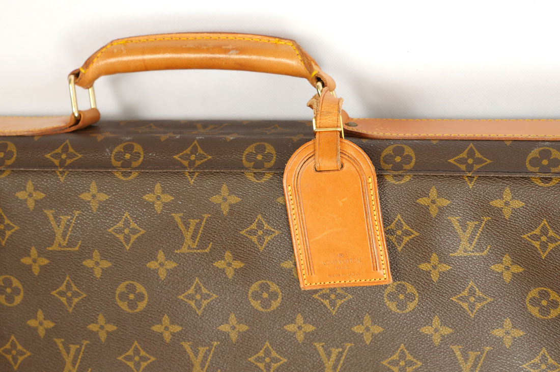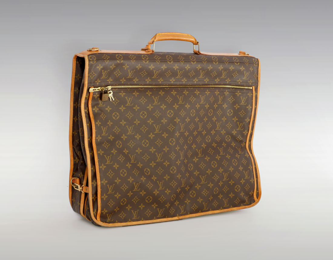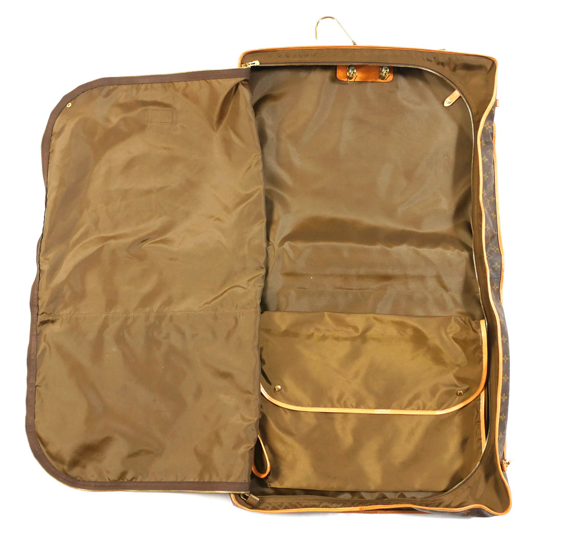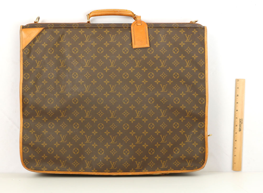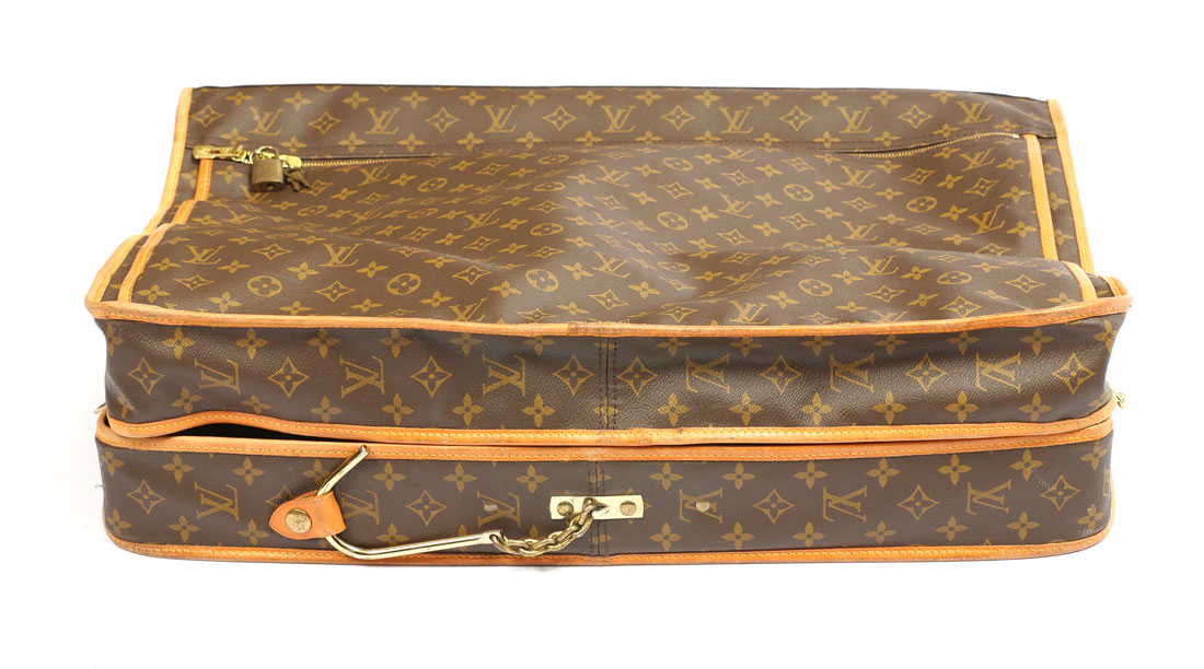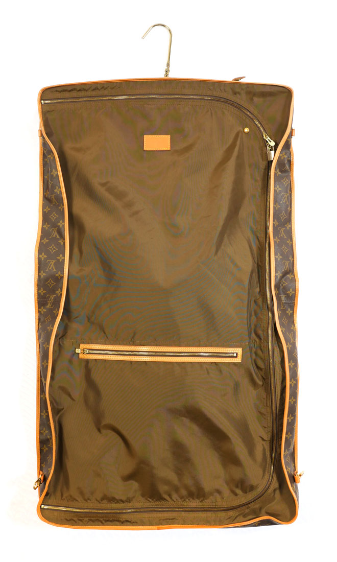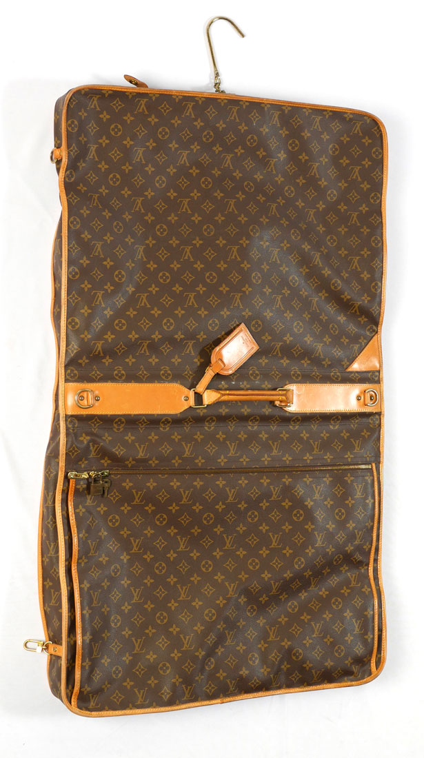 LUXURIOUS LOUIS VUITTON MONOGRAMMED 3 HANGER GARMENT BAG- Classic emblazoned monogram LV logo, with gold hardware. One internal removable cover that fits inside the larger cover and one zipper closure on inside. Zippers stamped with LV logo and Wally lock closures inside stamped PAT #RE310, comes with lock and two keys. Measures 17.7'' x 21.7'' x 5.5''. Item was reportedly purchased at the Louis Vuitton Store in Fort Lauderdale, FL.
