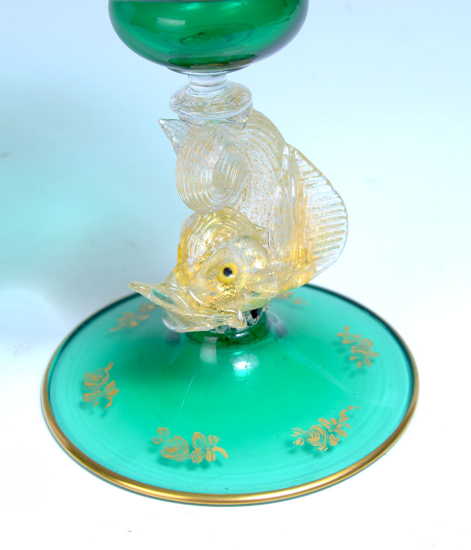 FIGURAL DOLPHIN STEM VENETIAN GLASS GOBLET: Green glass cup and foot, top cup with applied gilt Venetian outdoor genre scene, aventurine clear glass figural dolphin stem, foot with gilt floral decoration. Overall 7 3/4'' h. x 5''.