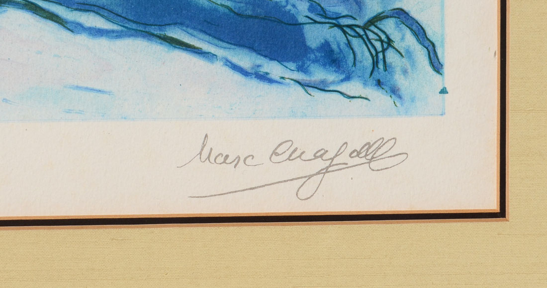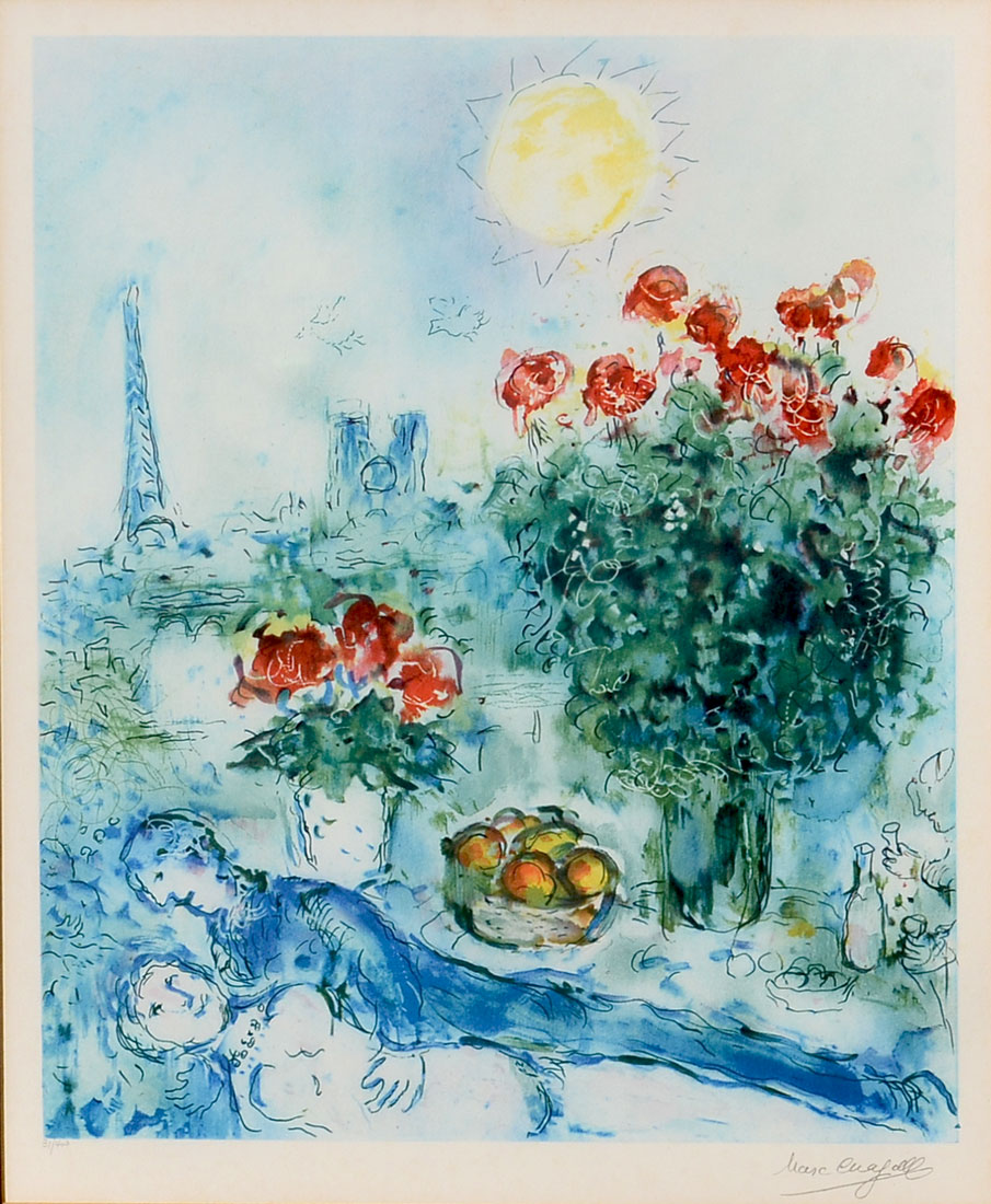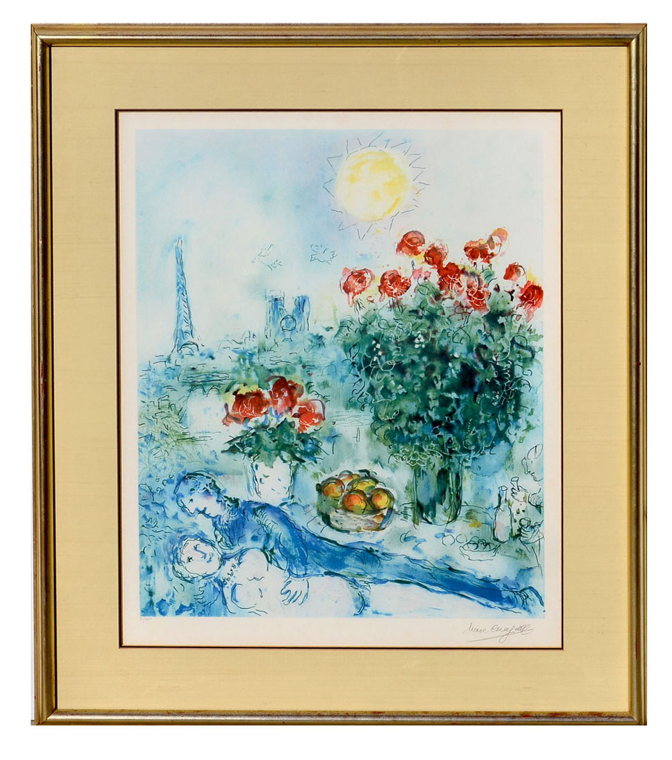 MARC CHAGALL LITHOGRAPH: ''Young Lovers in Paris'', sight size is 24'' x 19.50'', signed in the plate lower right, custom frame is 32.50'' x 27.50''.