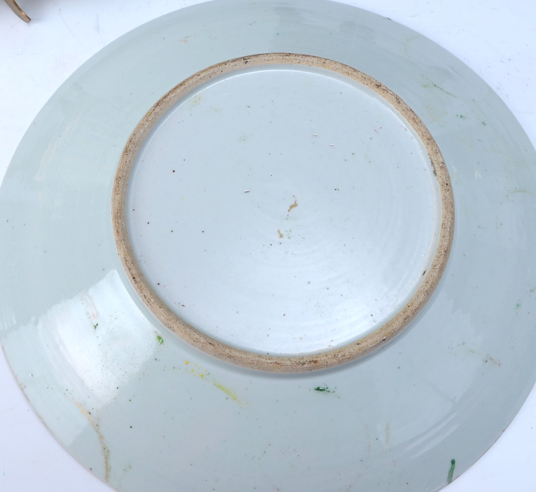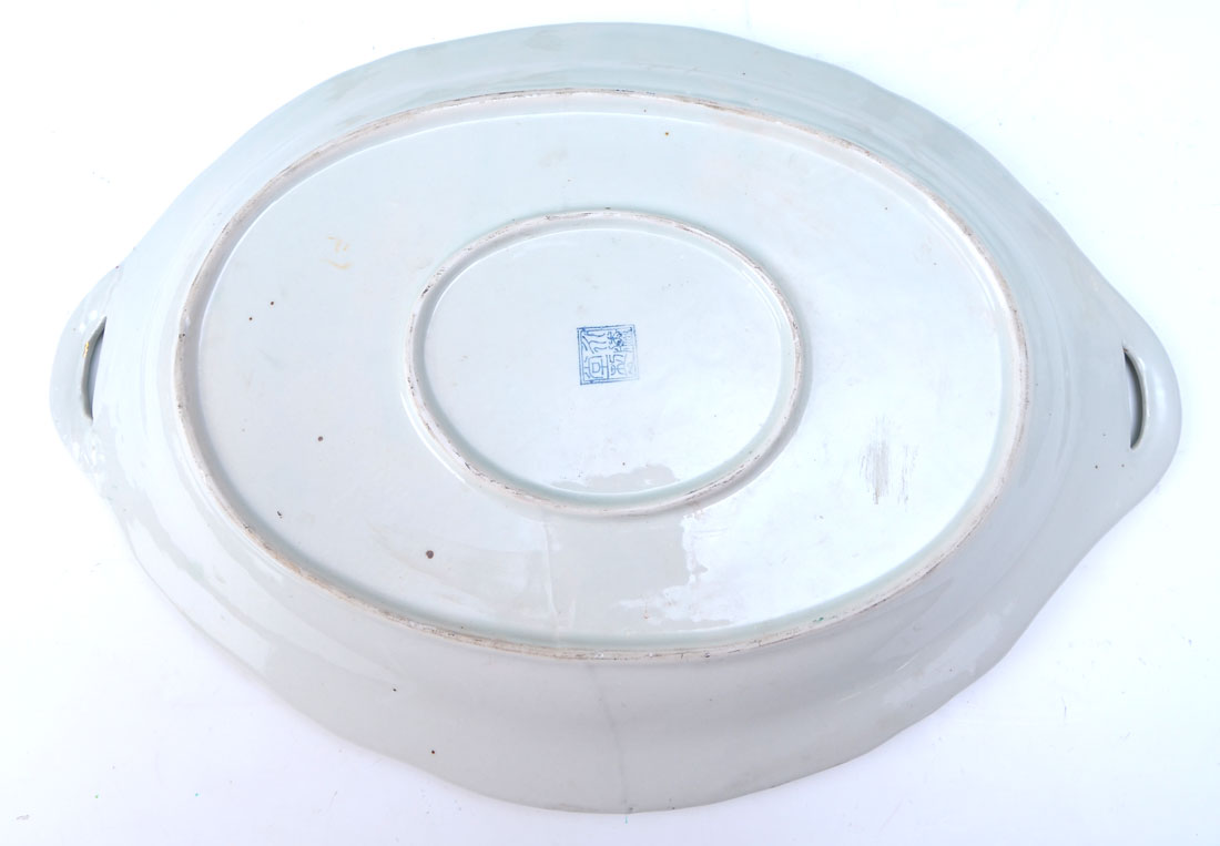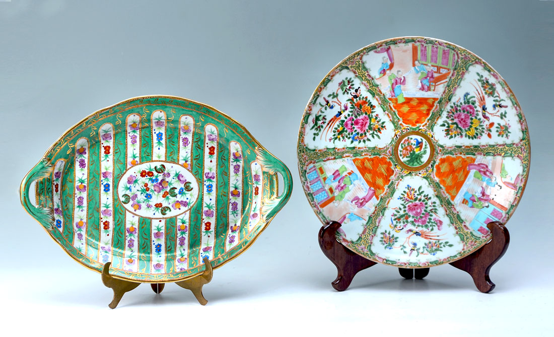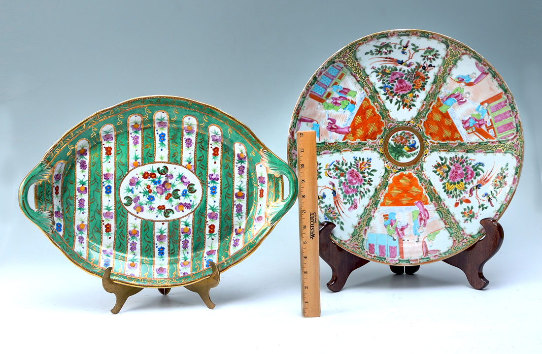 ORIENTAL CHARGER AND PLATTER: 2 pieces total to include 1) Large rose medallion charger, unmarked, 2 1/2'' h. x 16'', sold with stand. 2) Oval double handled platter, floral decoration, unknown mark on back. 18'' x 12 3/4''.