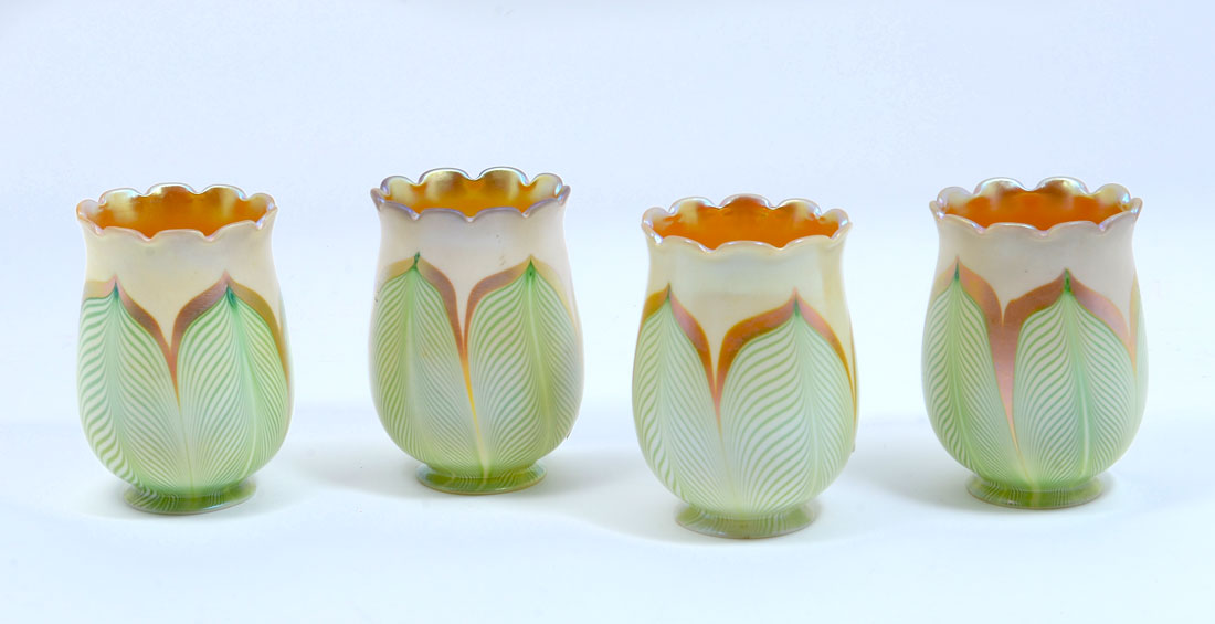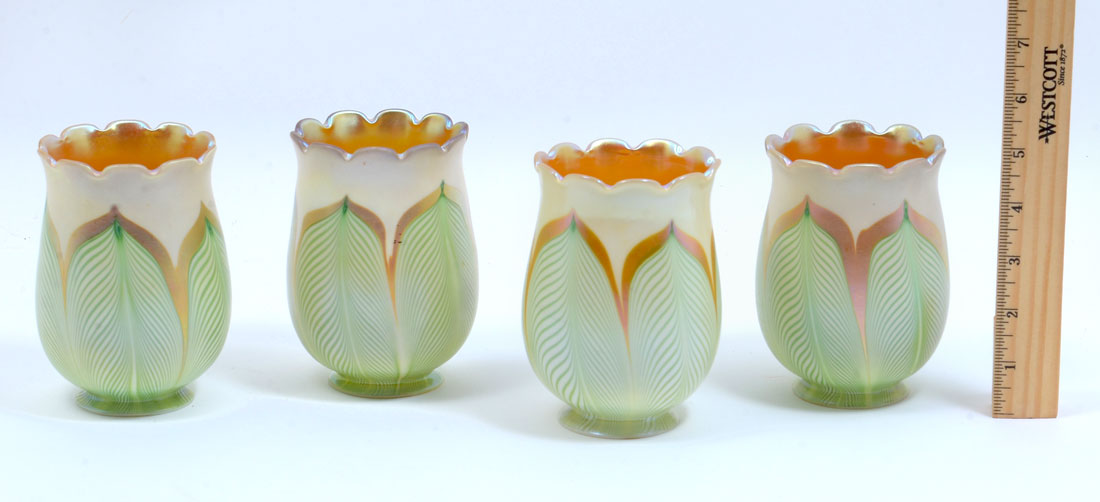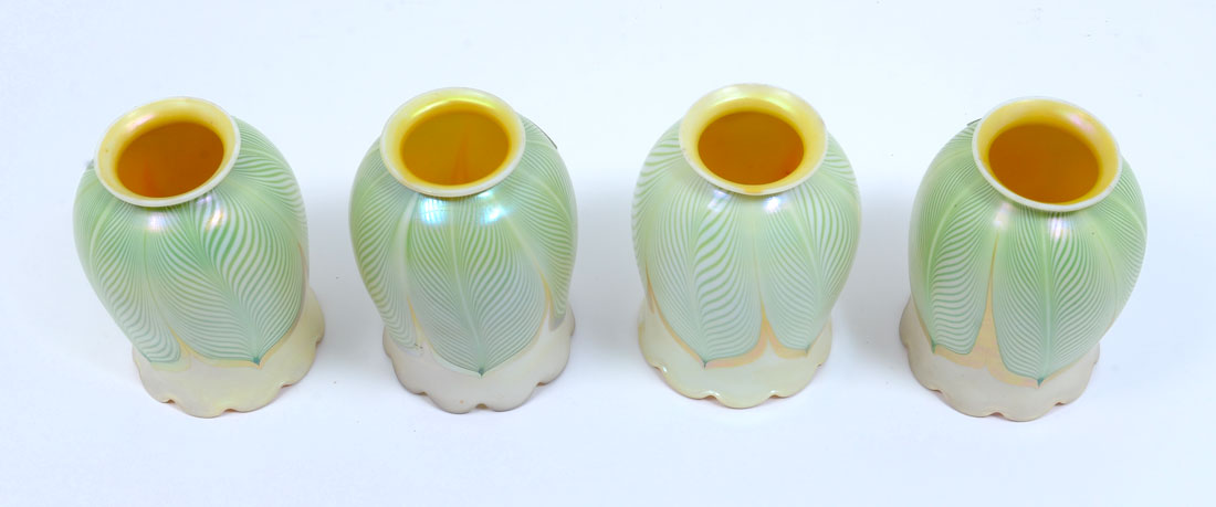4 PULLED FEATHER IRIDESCENT ART GLASS SHADES: Attributed to Steuben, pulled feather design on cream ground, iridescent gold Aurene type interior, ruffled rim. Overall measures 4 7/8'' h. x 3 3/8'', fitter rim 2 1/4''.