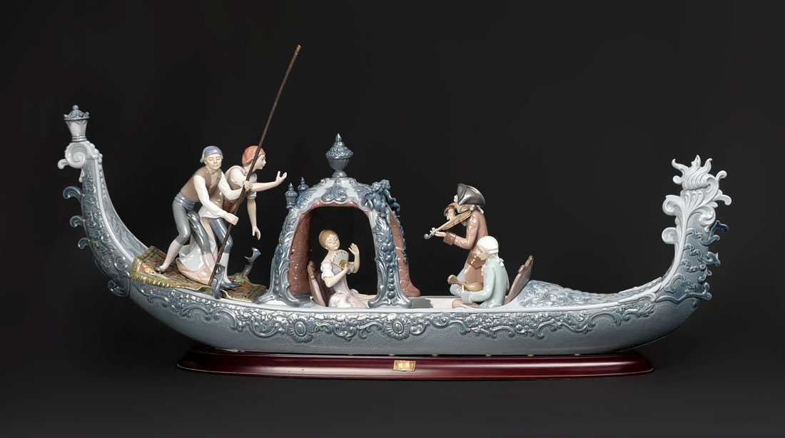 LLADRO VENETIAN SERENADE 1433 PORCELAIN FIGURAL GROUP: Spanish name ''Gondola Barroca'', sculptor Francisco Catala, issued 1983, retired 1989, Elite Limited Edition 327/750, glazed finish, 13 1/2'' h. x 39 1/4'', sold with wood base.