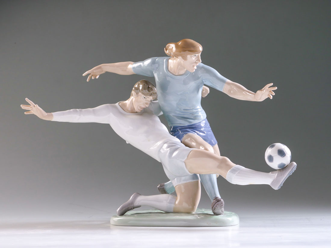 LLADRO SHOT ON GOAL 5879 PORCELAIN FIGURINE: Spanish name ''Futbolistas'', sculptor Fulgencio Garcia, issued 1992, retired 1996, glazed finish, 10 3/4'' h., sold with wood base.