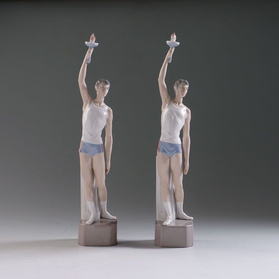 PAIR LLADRO TORCH BEARER 5251 PORCELAIN FIGURINES: 2 pieces total, Spanish name ''Trofeo'', sculptor Salvador Furio, issued 1984, retired 1987, glazed finish, 16 1/2'' h.