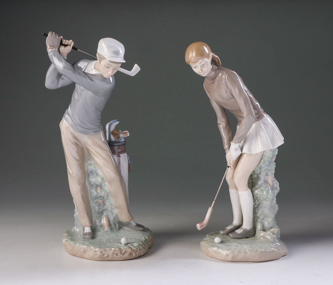 PAIR LLADRO PORCELAIN GOLFING FIGURINES 4824 & 4851: 2 pieces total, both by sculptor Vincente Martinez, glazed finish, to include 1) Male Golfer, 4824, Spanish name ''Jugador de Golf, issued 1972, 10 3/4'' h. 2) Lady Golfer, 4851, Spanish name, ''Jugadora de Golf'', issued 1973, retired 2005, 11 1/4'' h.