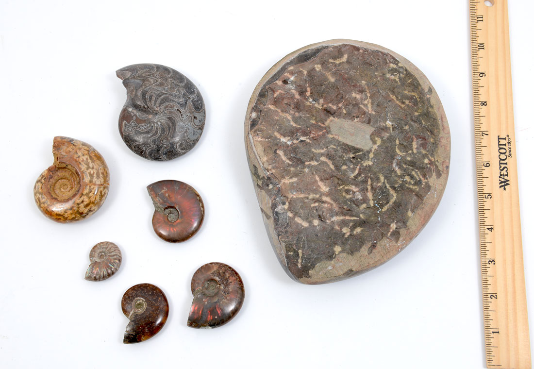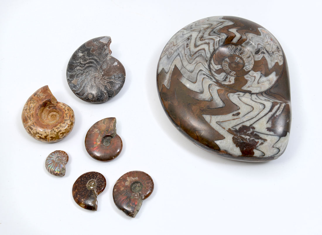 7 PIECE FOSSIL AMMONITE: Largest 7 3/4'' dis, smallest 1 1/8'' dia.