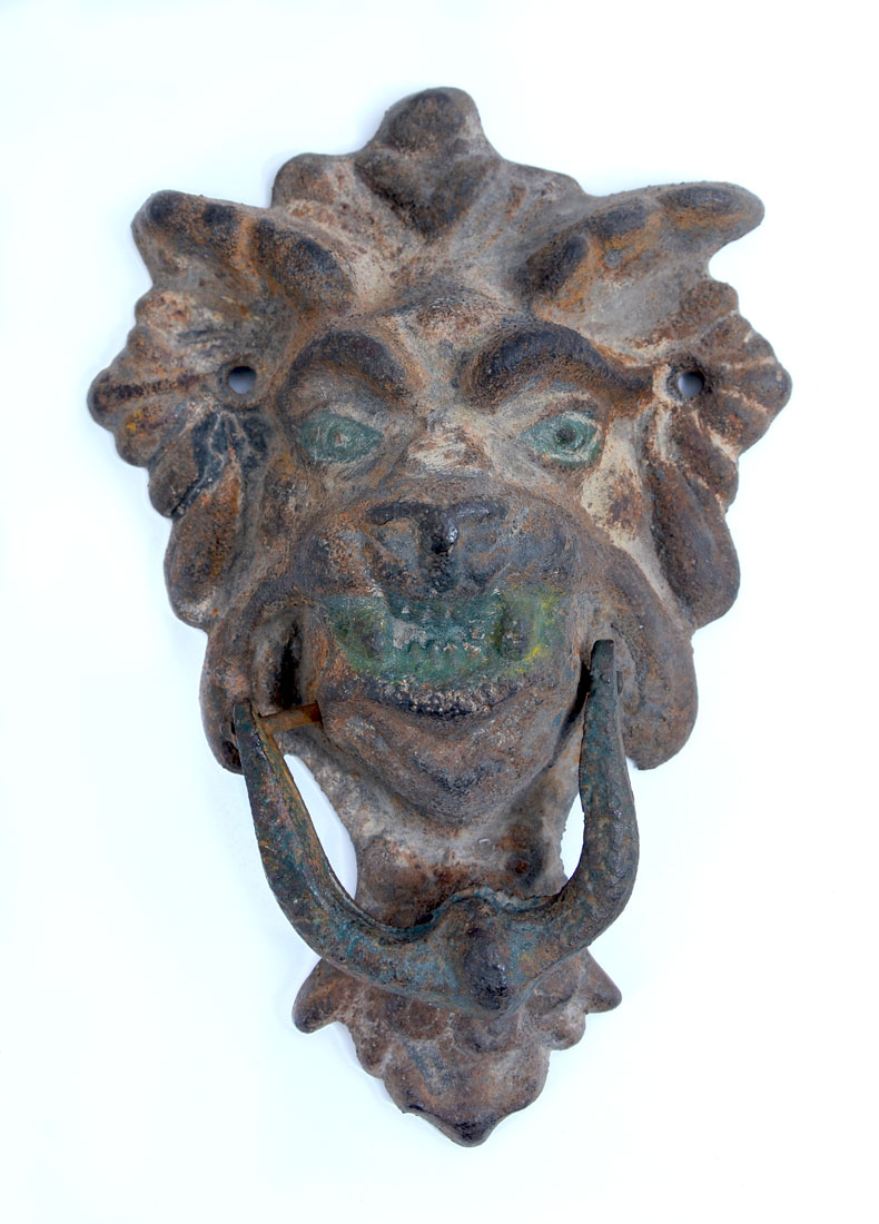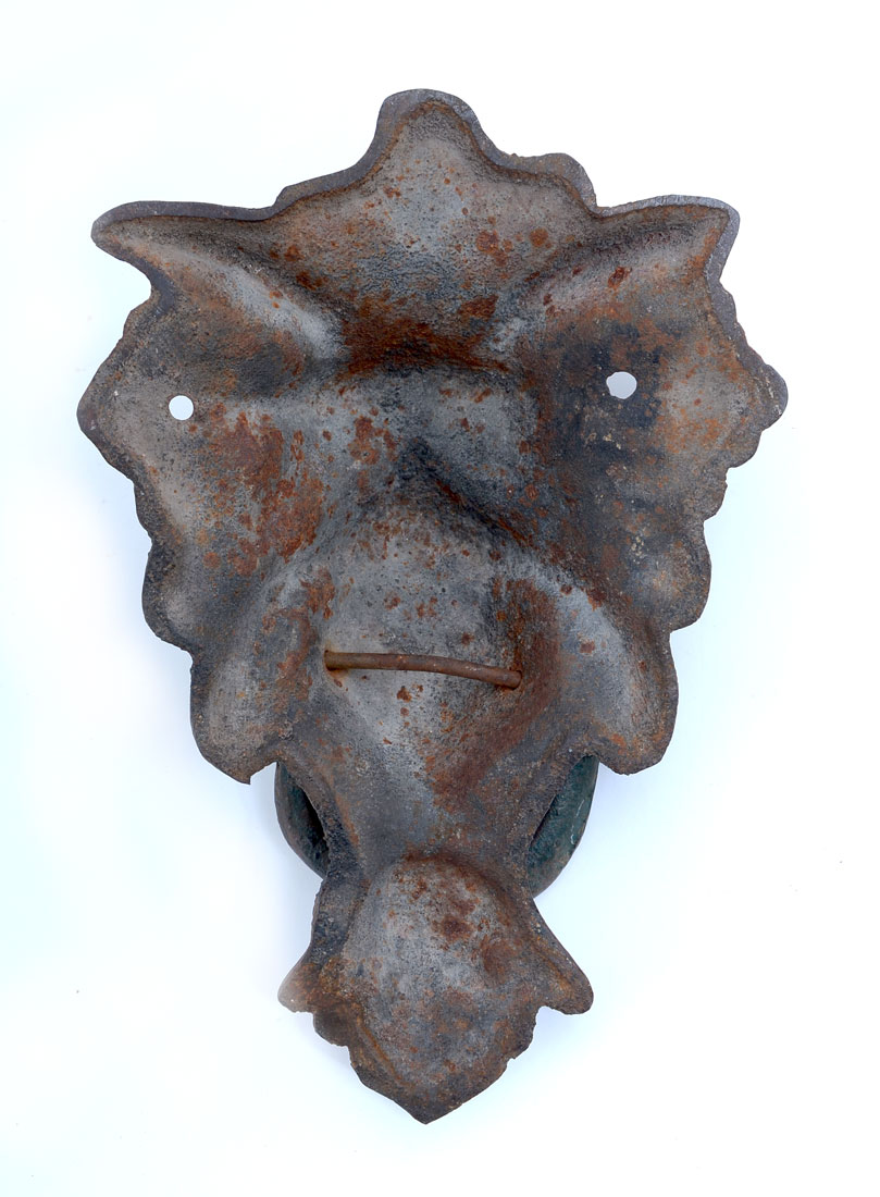 CAST IRON GARGOYLE DOOR KNOCKER: Gargoyle masqueron form with traces of paint remaining, 11 1/2'' h. x 7'' x 3 1/4''.