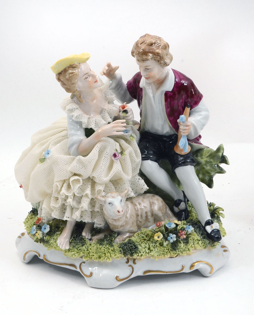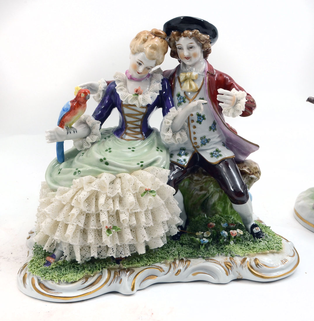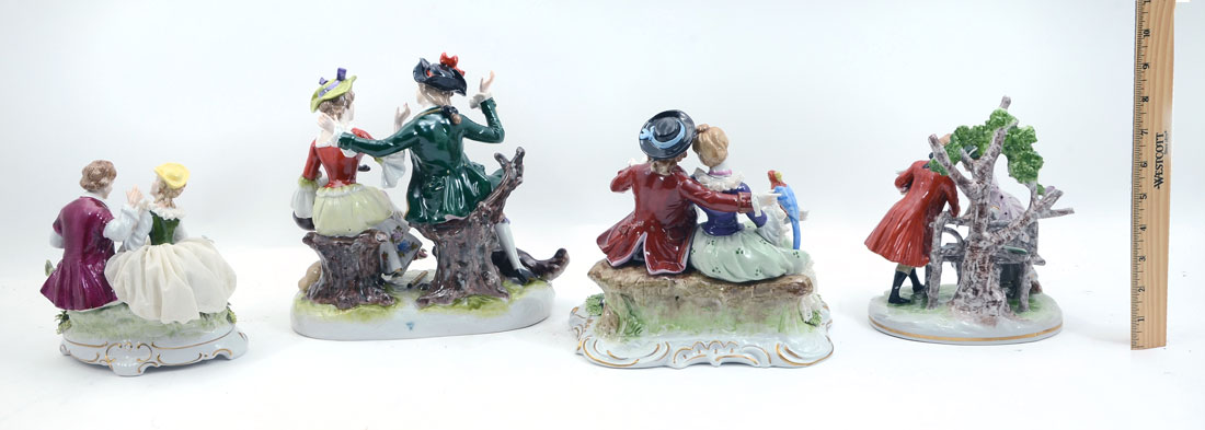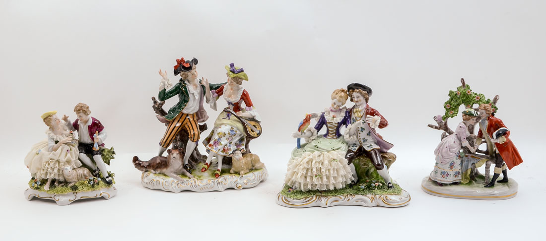 4 DRESDEN STYLE PORCELAIN & LACY FIGURAL GROUPS: An assembled collection of 4 figural groups of lovers, assorted makers marks, 2 with lacy dresses. Largest measures 8'' h. x 9'' x 5 1/2''.