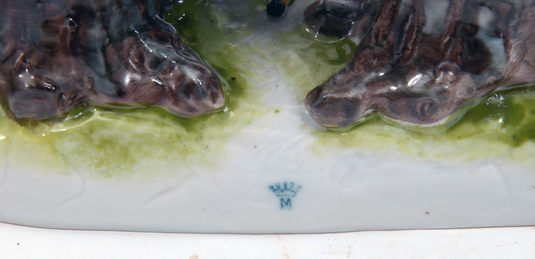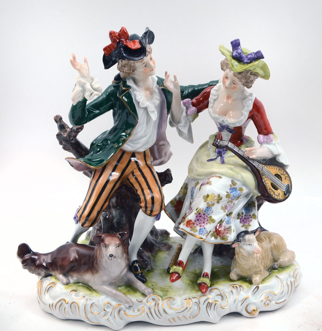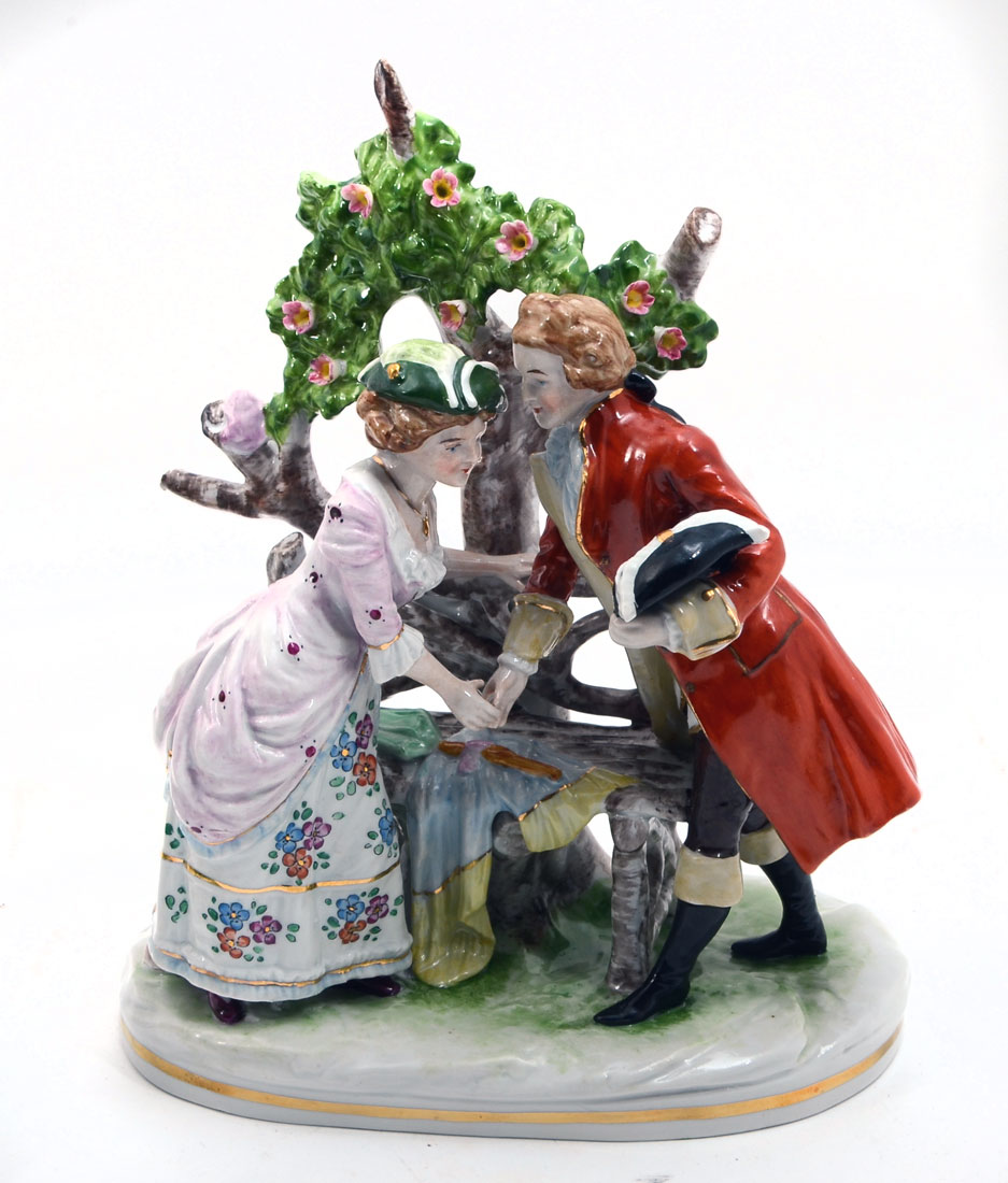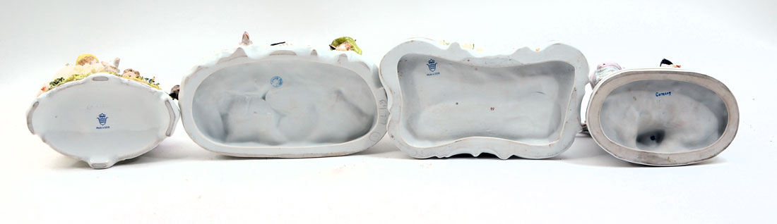 4 DRESDEN STYLE PORCELAIN & LACY FIGURAL GROUPS: An assembled collection of 4 figural groups of lovers, assorted makers marks, 2 with lacy dresses. Largest measures 8'' h. x 9'' x 5 1/2''.