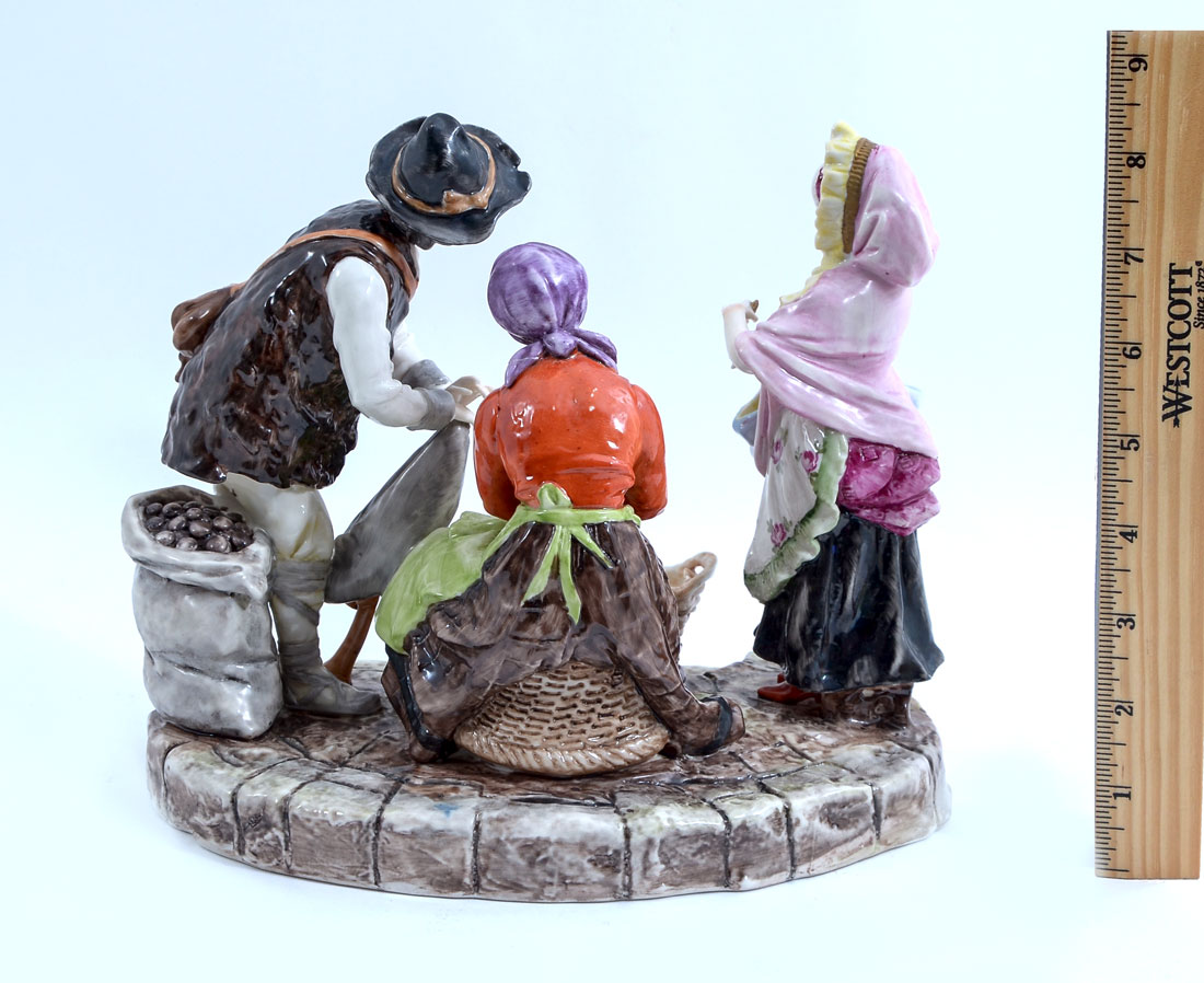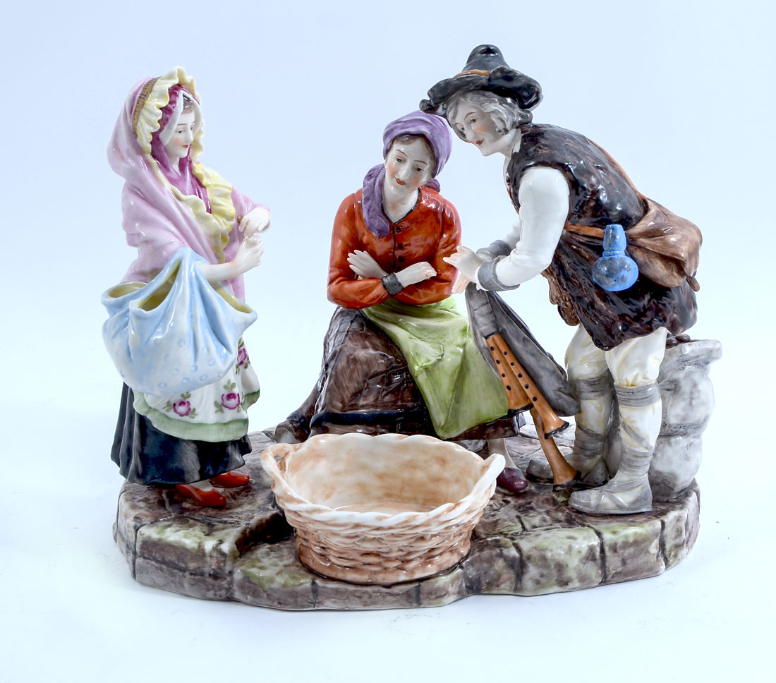 GERMAN PORCELAIN FIGURAL GROUP: Figures of 2 woman and man with bagpipes around a basket, illegible blue German crown mark, 8'' h. x 9 1/2''.