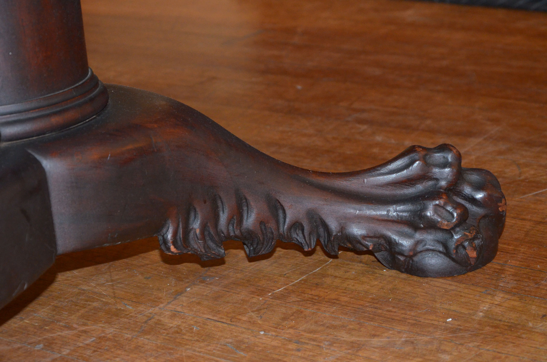 HORNER QUALITY CARVED MAHOGANY DINING TABLE: Horner quality mahogany dining table with a 4-column split base having legs with carved hair hanging as a lion's hair does. High relief 3-toed paws on onion ball feet. Lever release mechanism resides on underside of table. Also included is 4 leaves. Leaves Approx. 12'' w x 54'' l. Table Approx. 29.25'' h x 54'' w.