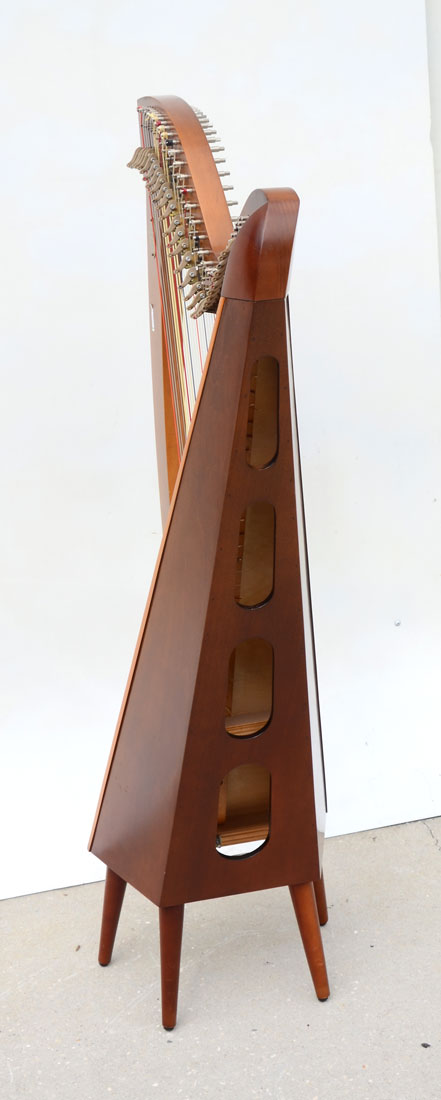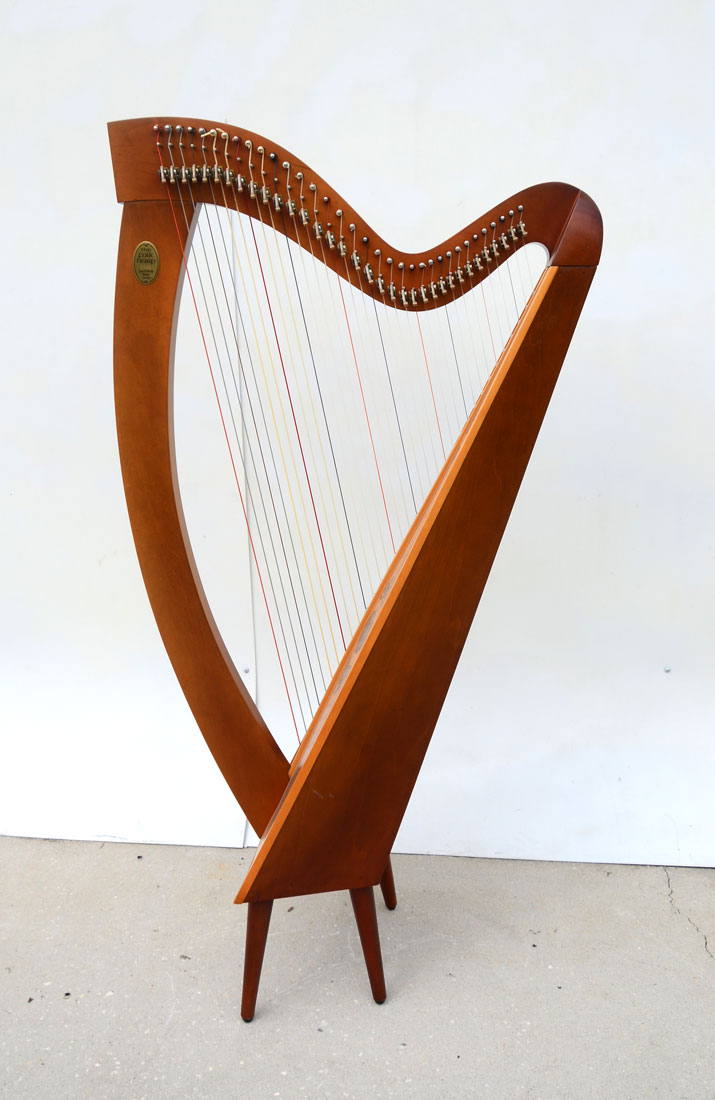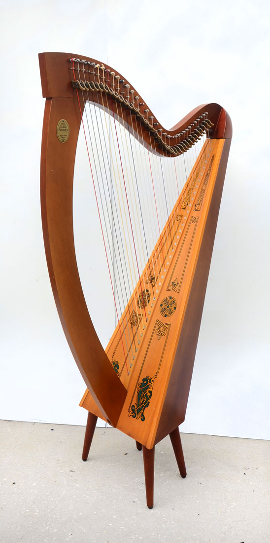 LYON & HEALY LEVER FOLK HARP: Serial number 2589. Bird's eye and mixed wood with Celtic decoration. Sold with the carrying case. 54 3/4'' h. x 29'' x 26''. Purchased new in 1999, and barely used.
