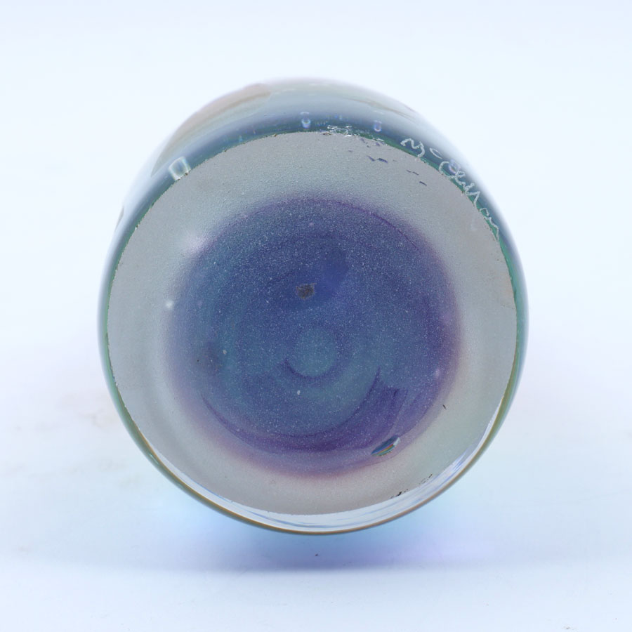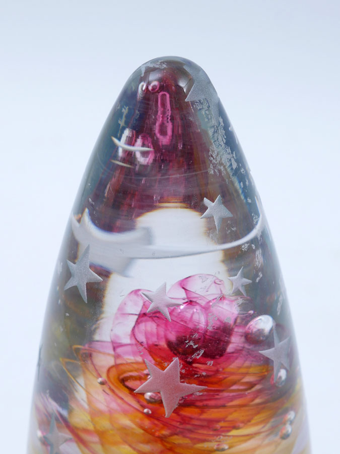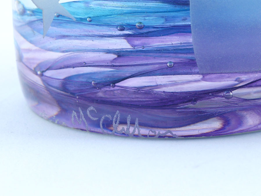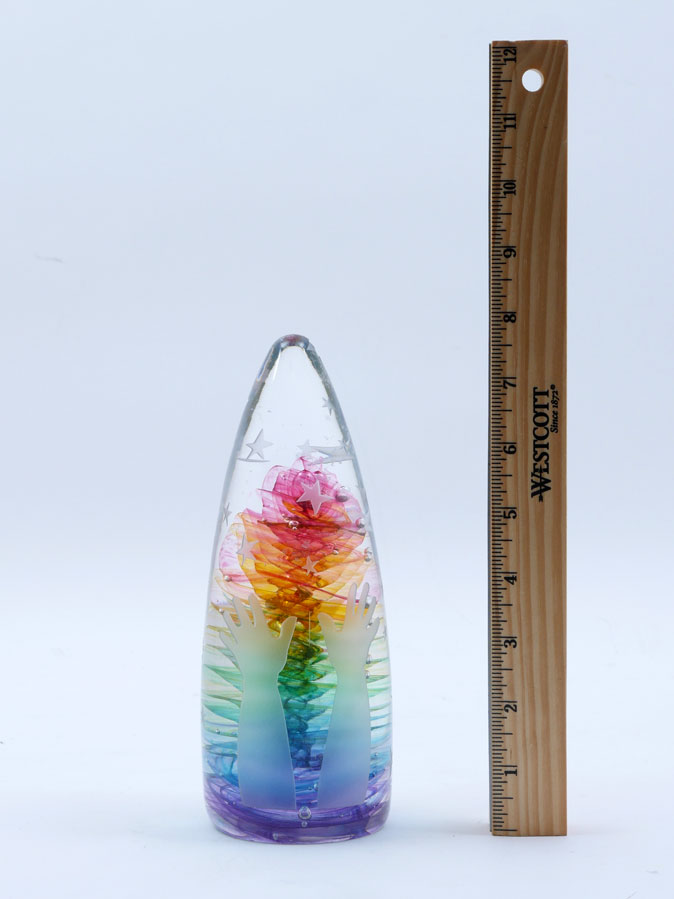 DUNCAN MCCLELLAN REACH FOR THE STARS PAPERWEIGHT: With multi-hued internal swirls, etched glass hands and arms with stars, signed McClellan at base, 7 1/2'' h.