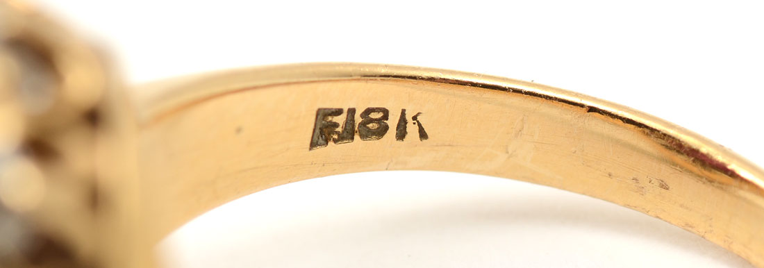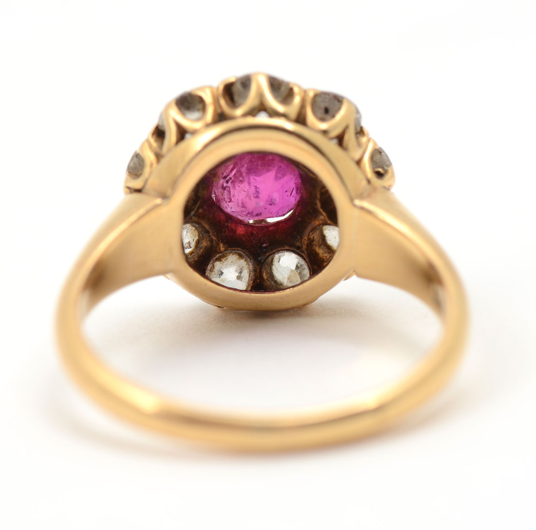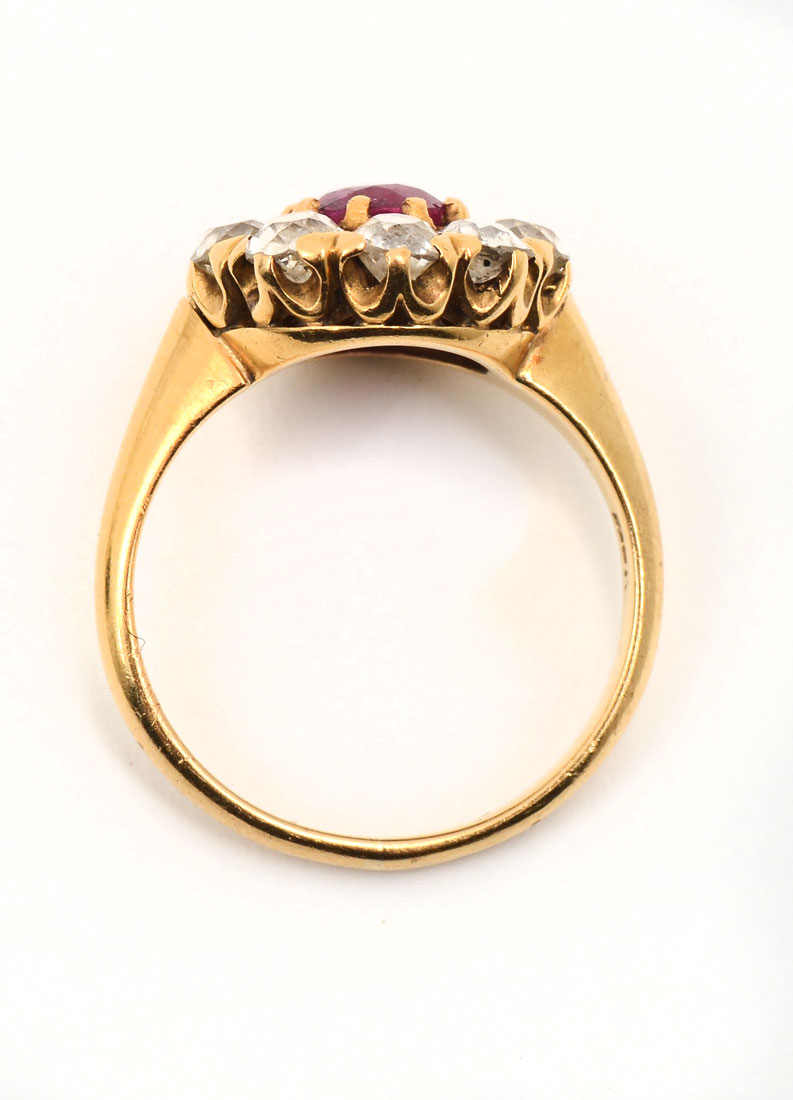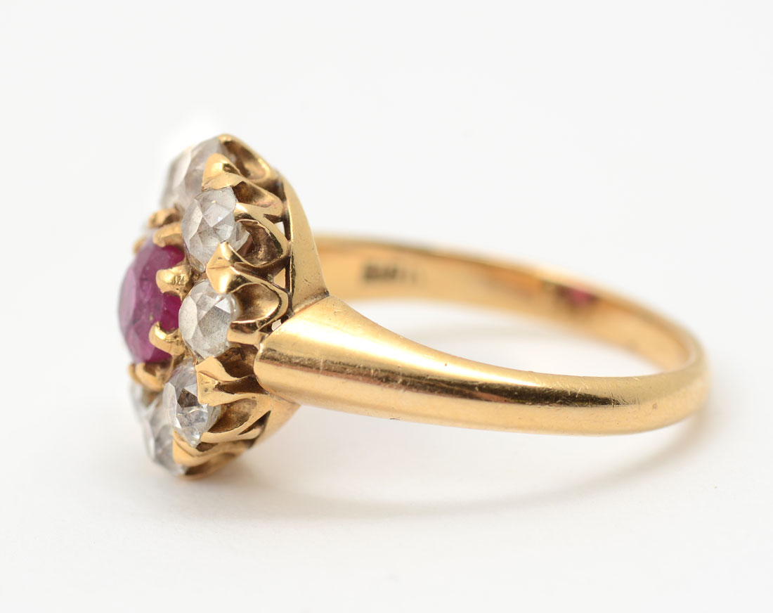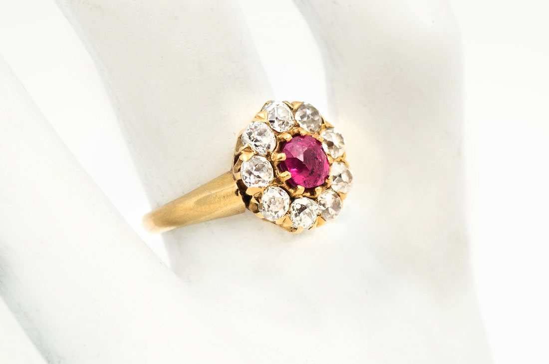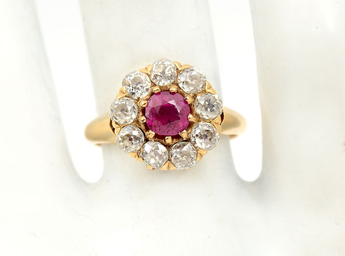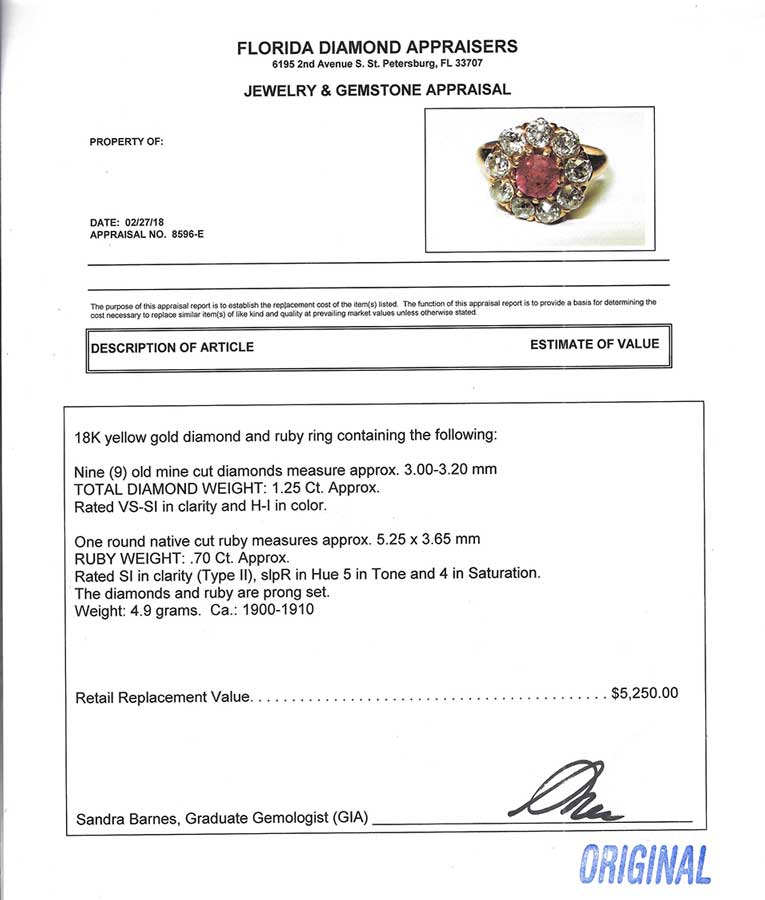 VINTAGE 18K DIAMOND & RUBY RING: A single native cut ruby is rated SI in clarity and centers this lovely ring. 9 old mine cut diamonds approx 1.25 CTW rated VS-SI in clarity and H-I in color. Total weight 4.9 grams. Ca 1900-1910. Sold with current Florida Diamond Appraisers GIA graduates appraisal for $5250.