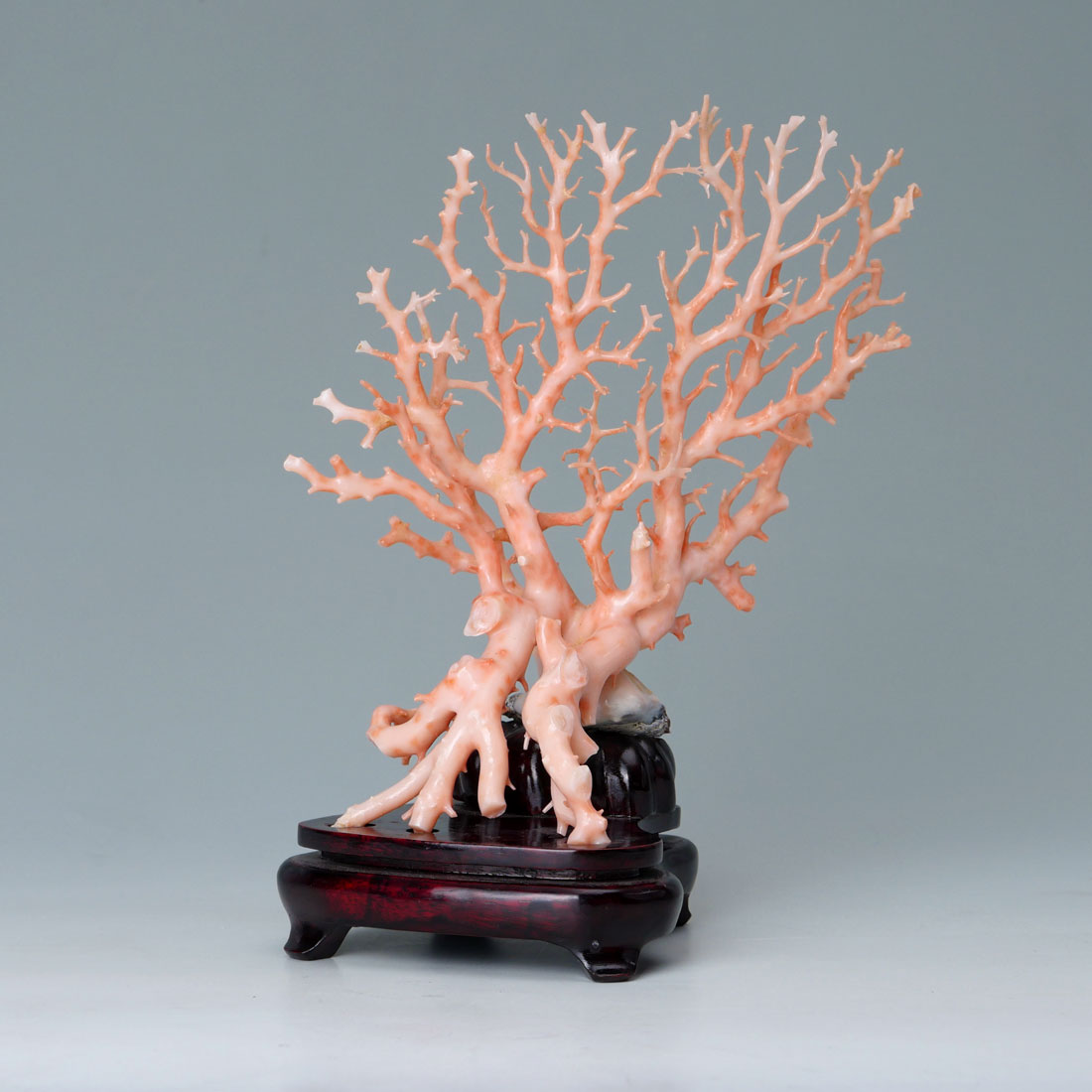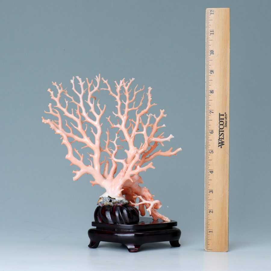 PINK CORAL BRANCH FORMATION: Multi branch formation, hand worked, approx. 199 grams. Measures 7 3/4'' h. x 7'' x 5 1/4''. Sold with a fitted wood stand.