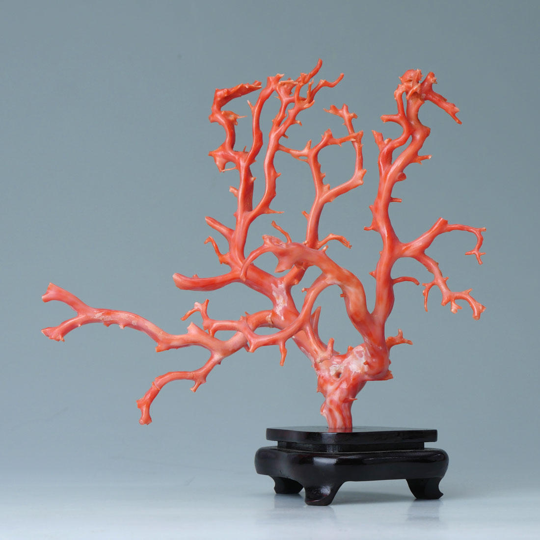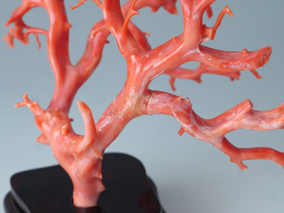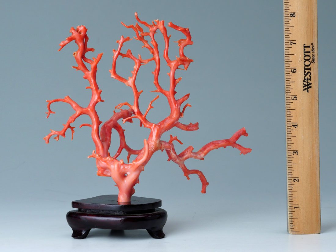 PINK CORAL BRANCH FORMATION: Multi branch formation, hand worked, approx. 142.2 grams. Measures 7'' h. x 8 1/4'' x4 1/4''. Sold with a fitted wood stand.