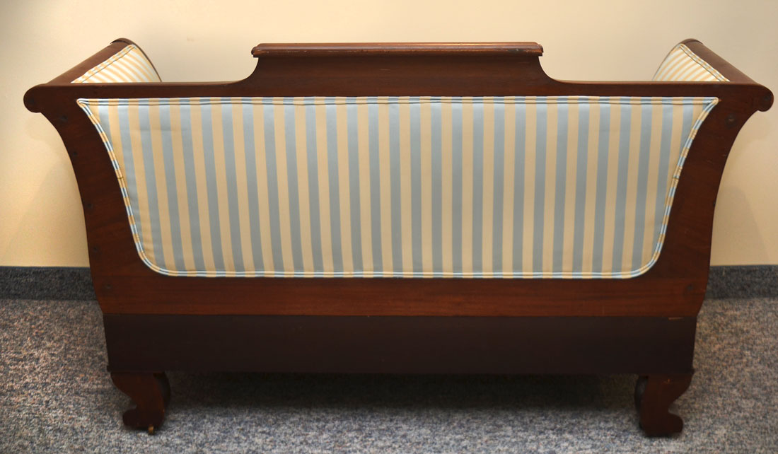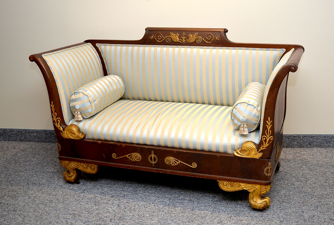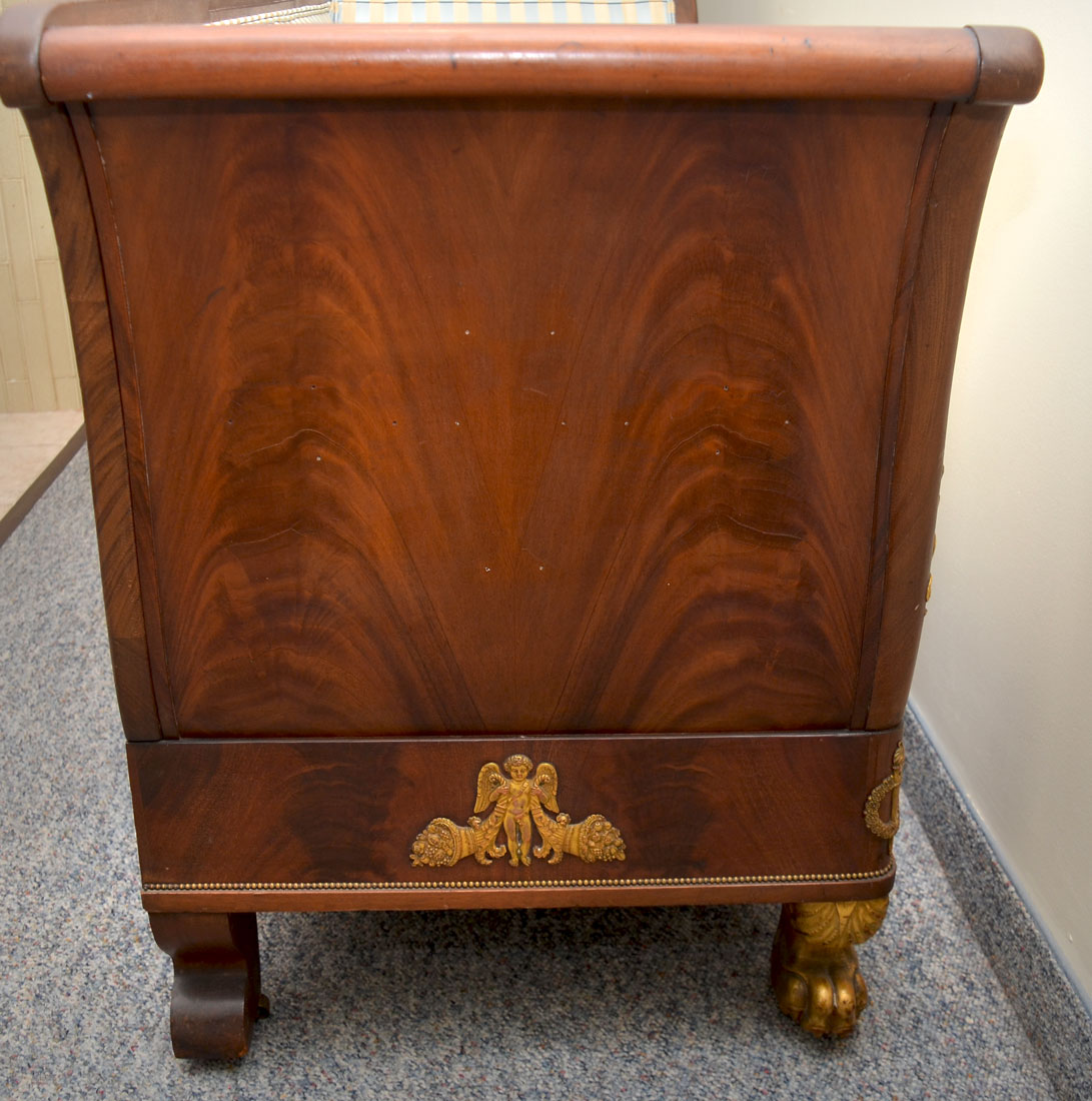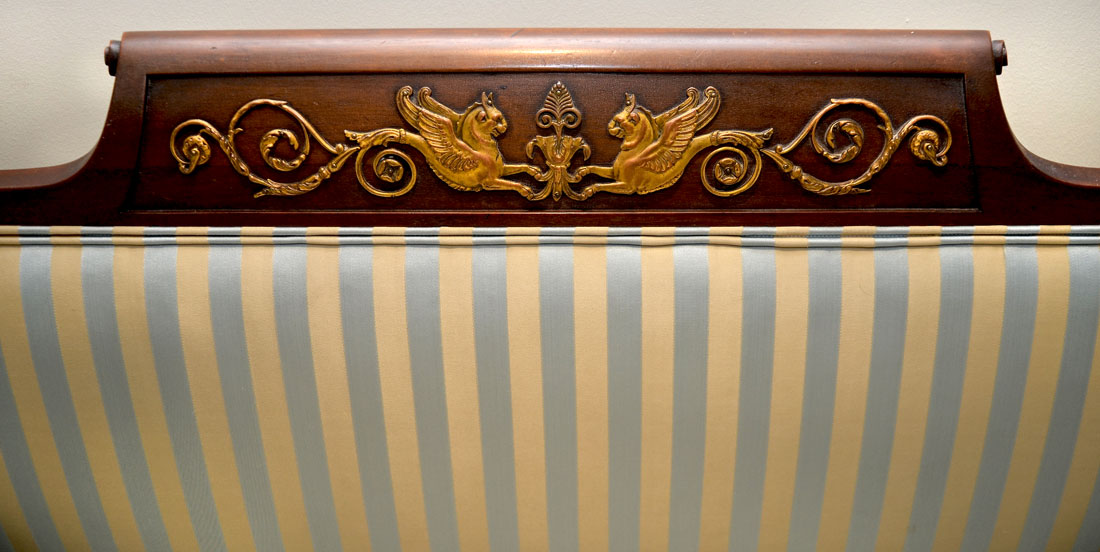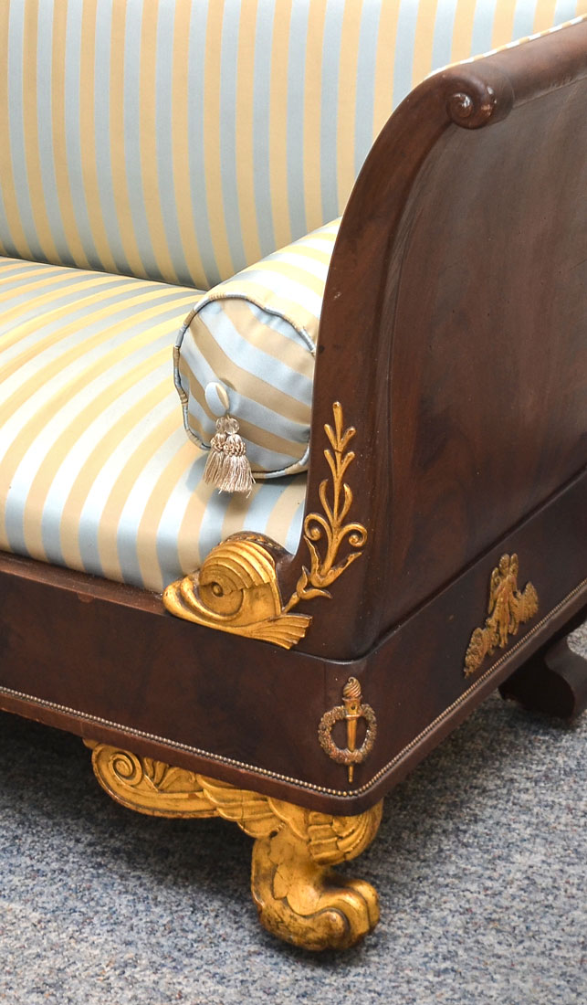 FRENCH EMPIRE SETTEE: Top rail center crest with applied gilt metal griffin and foliate scroll accents, outward turned arms, carved giltwood figural dolphin heads over skirt with applied decoration. Carved paw front feet, all on castors. Blue and cream striped upholstery, 2 throw pillows, overall measures 38 1/2'' h. x 67 1/2'' x 24''.