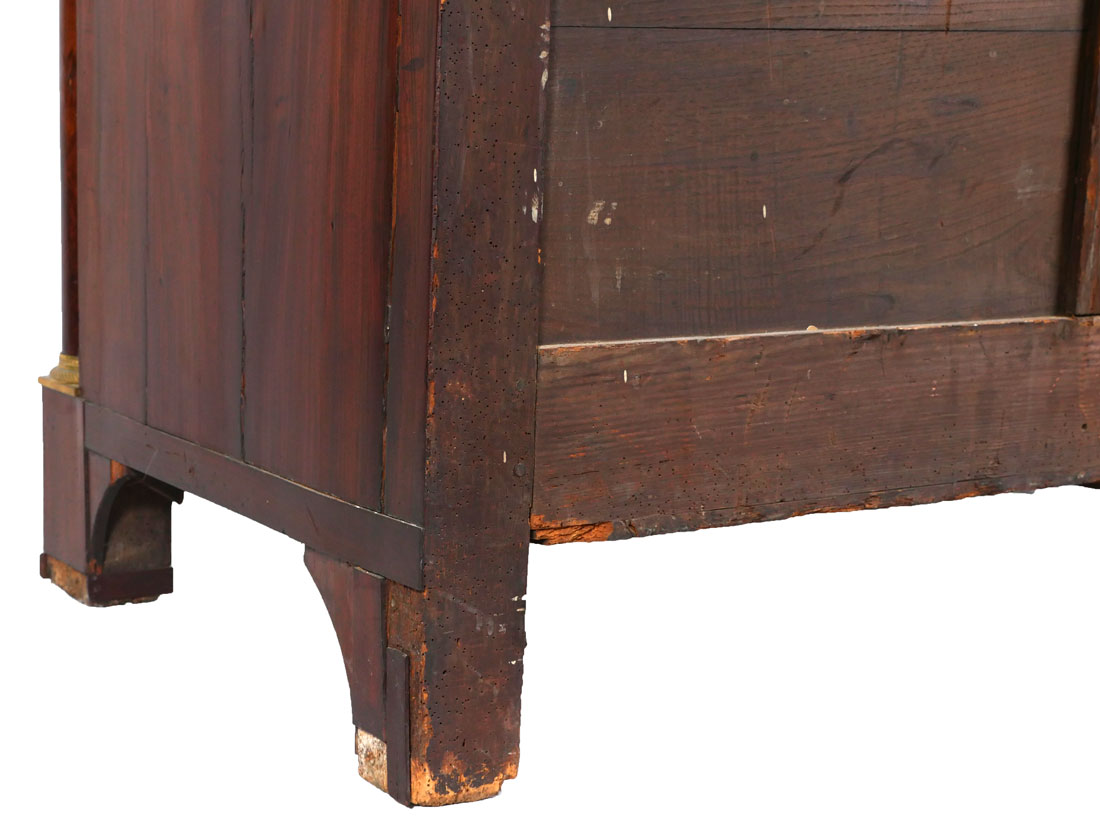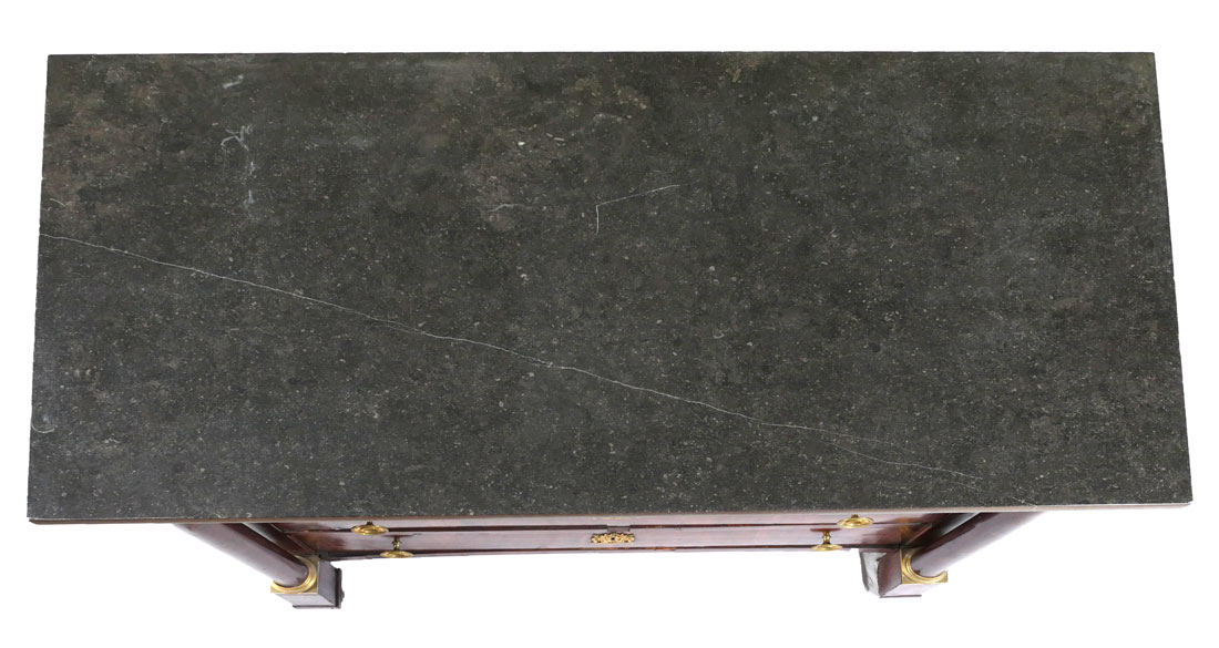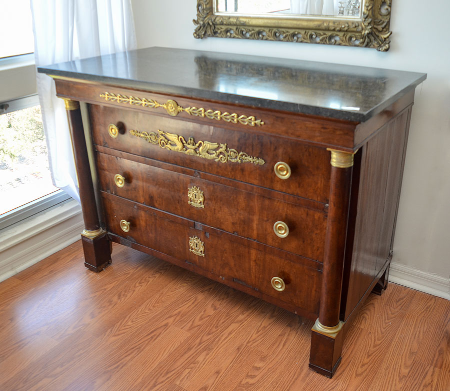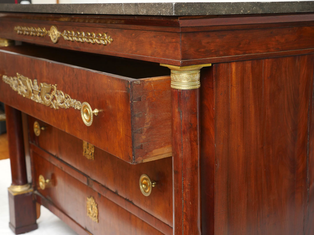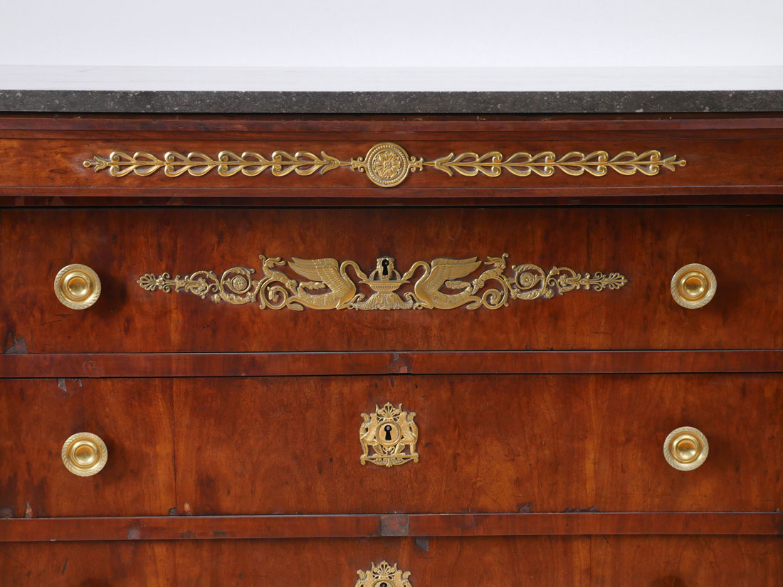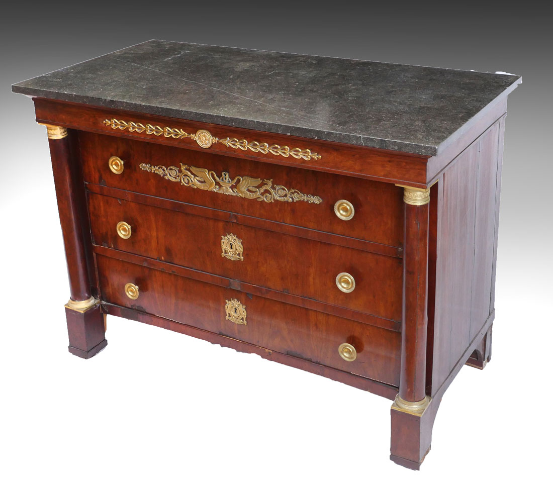 MAHOGANY FRENCH EMPIRE COMMODE WITH ORMOLU MOUNTS: Variegated marble top over 3 drawers, turned full column supports, applied gilt metal mounts featuring swans, griffins, and foliate scroll. Overall 37'' h. x 50'' x 25 3/4''.