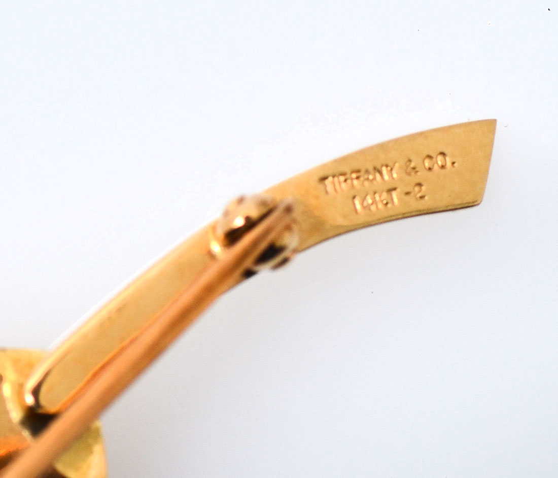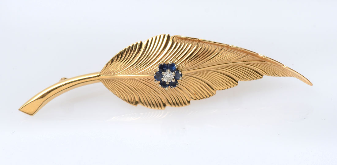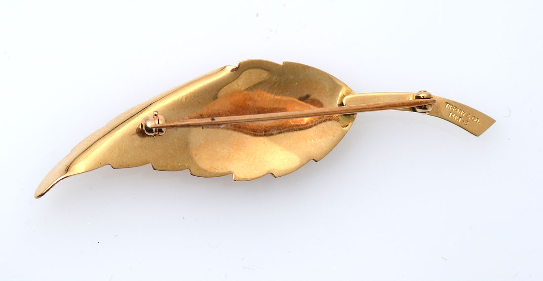 14K TIFFANY SAPPHIRE & DIAMOND LEAF PIN: Beautiful Tiffany & Co 14K Yellow Gold Vintage Leaf Pin With 0.025 Ct Genuine Diamond and 0.21 CTW blue sapphires. 2.5'' long. Weight 4.6 grams. Stamped Tiffany & Co 14K-2.