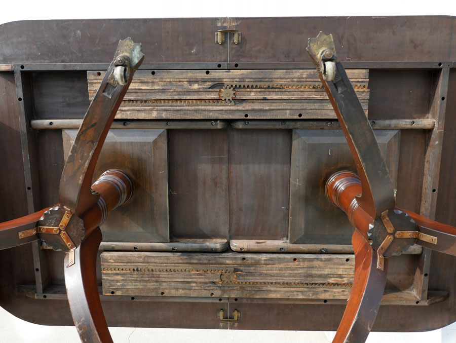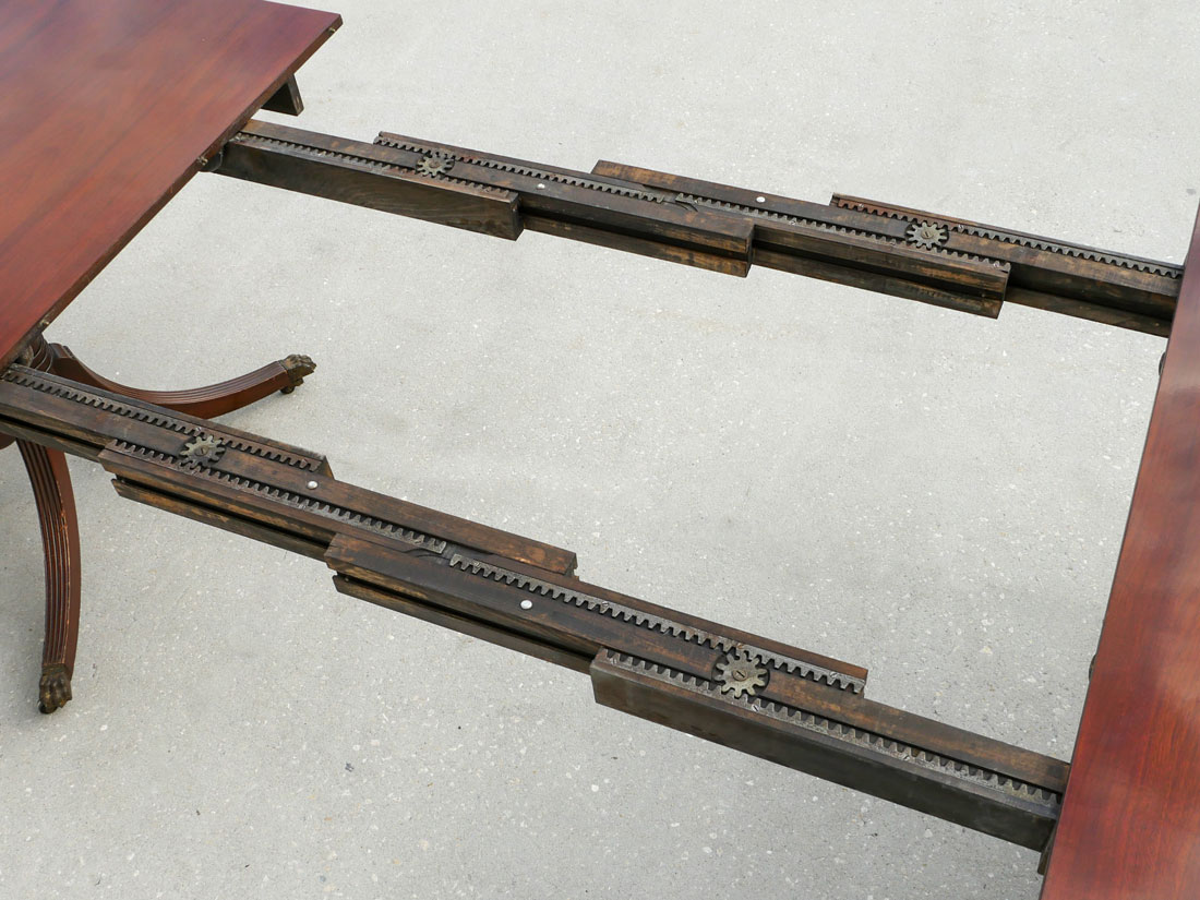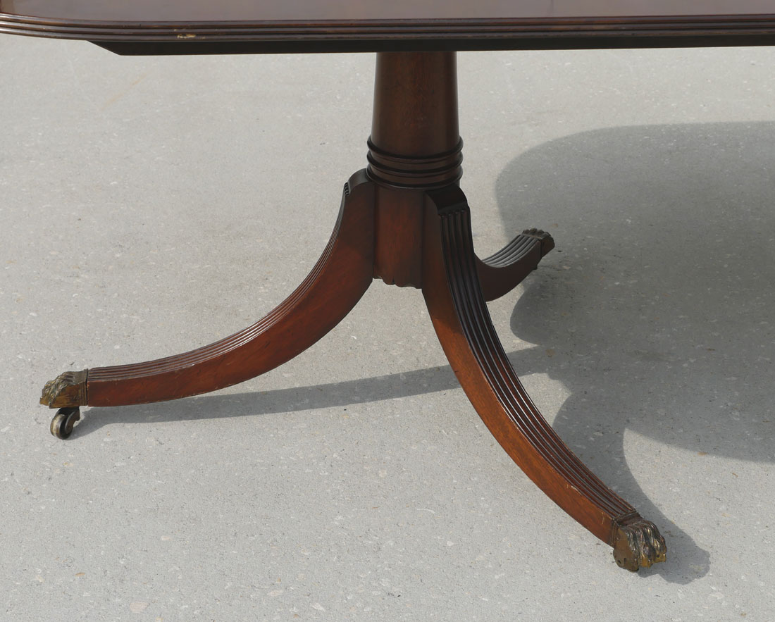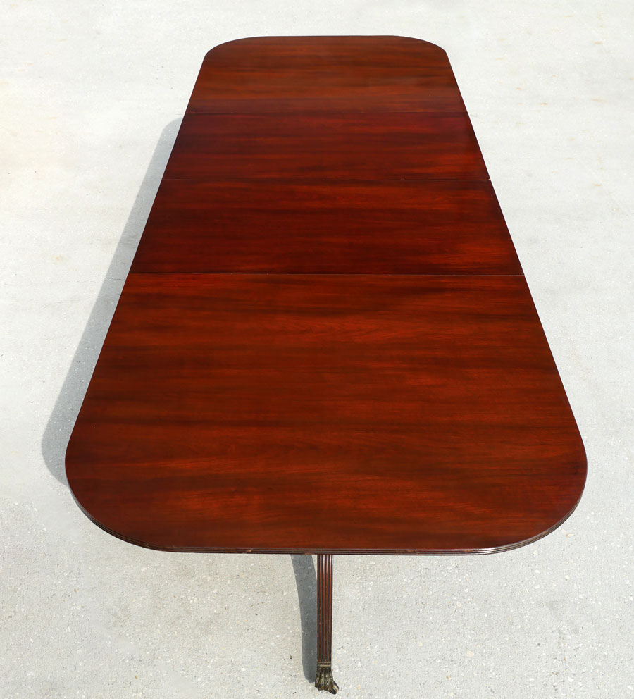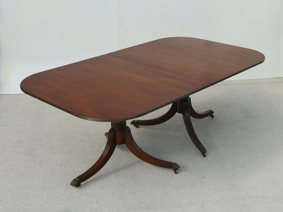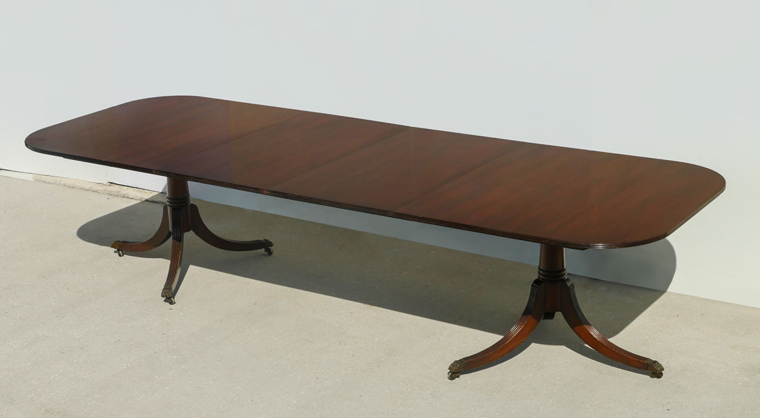 LARGE MAHOGANY DINING TABLE: Beautiful large Mahogany top on 6 scrolling fluted legs with casters. There are 2- 24'' leaves in a separate storage case. Table protection pads are included. Approx. 29.25'' h x 78'' l x 45'' w.