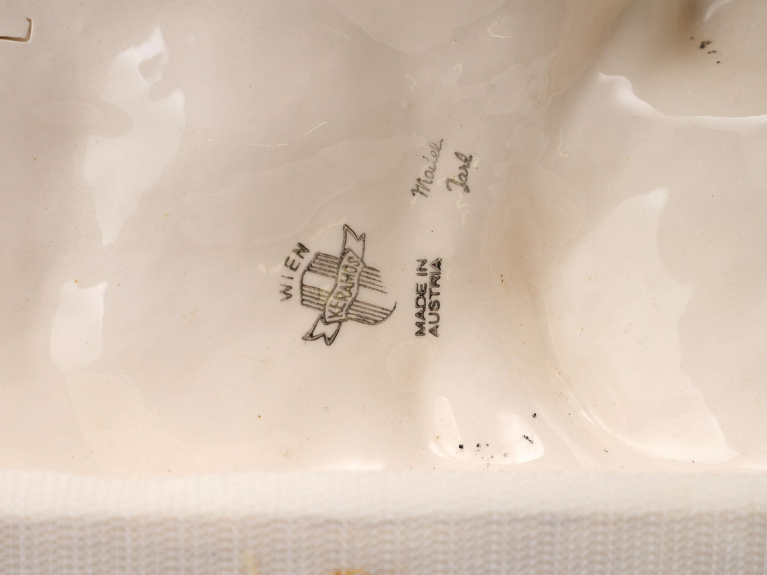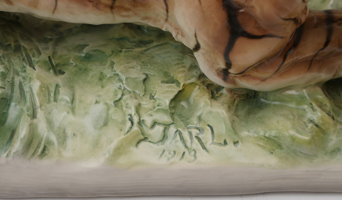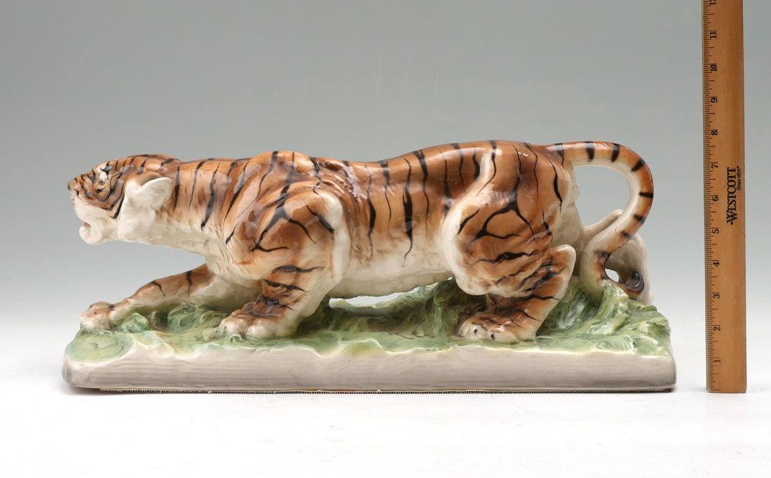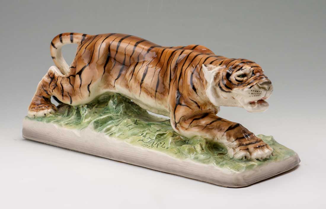 1913 OTTO JARL KERAMOS PORCELAIN FIGURAL TIGER: Large figure of a tiger on the prowl, designed by Otto Jarl for Keramos Wein (Vienna), marked on bottom with Keramos stamp, impressed 125, 2, L. 7'' h. x 20'' x 7''.