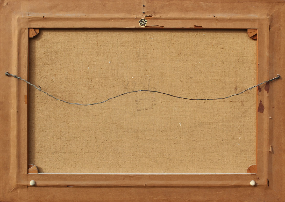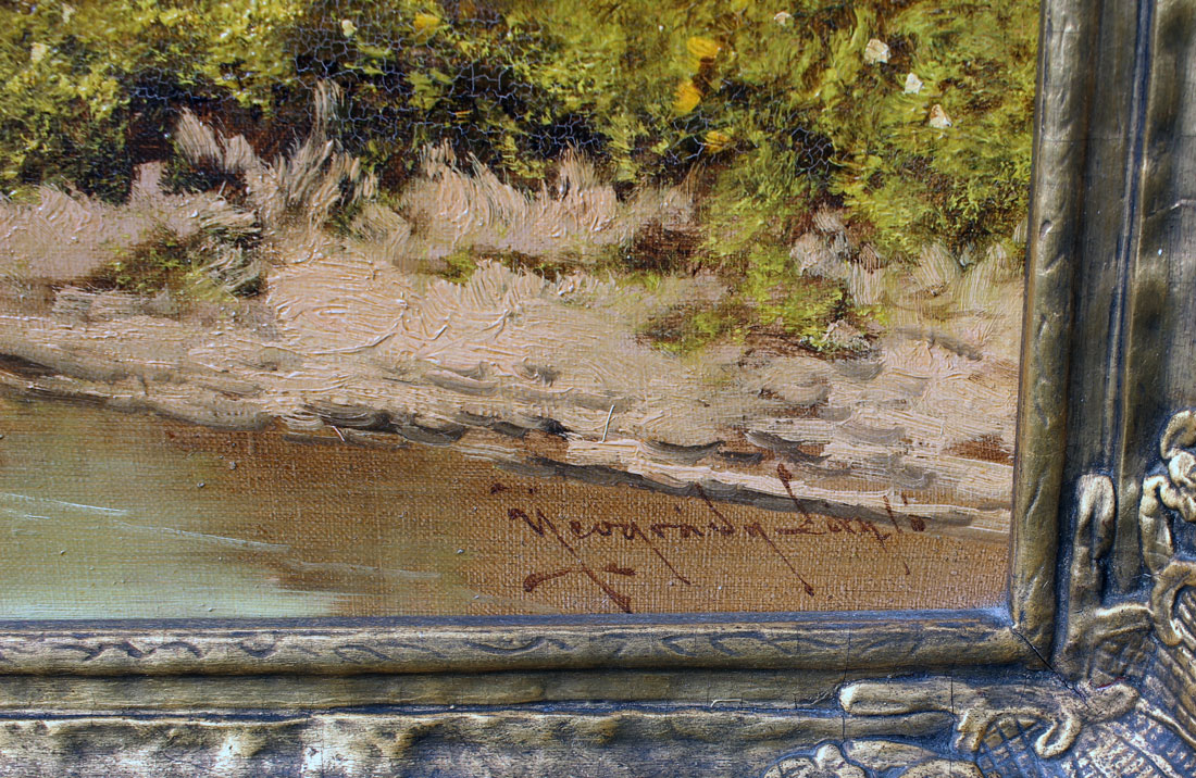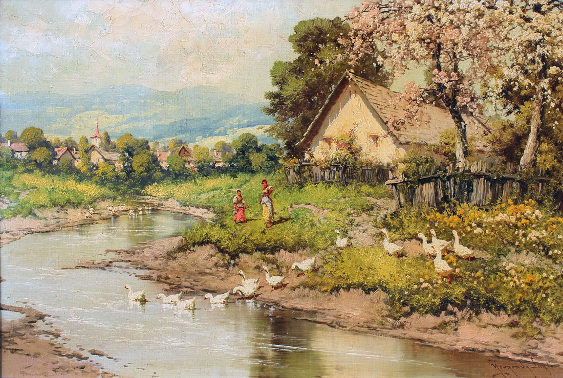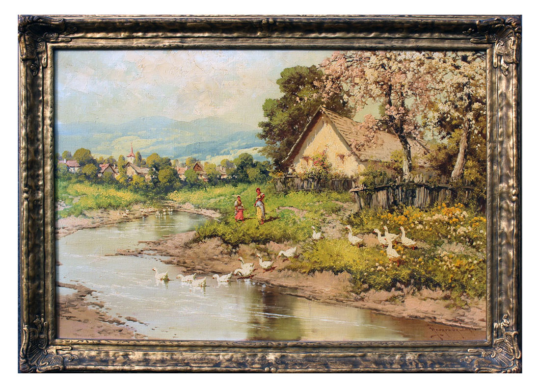 NEOGRADY, Laszlo, (Hungarian, 1896-1962): ''Village Scene with Two Young Girls and Geese Crossing a Stream'', Oil/Canvas, sight size is 24'' x 36'', signed lower right, fine period gesso frame measures 29.50'' x 41.50''.