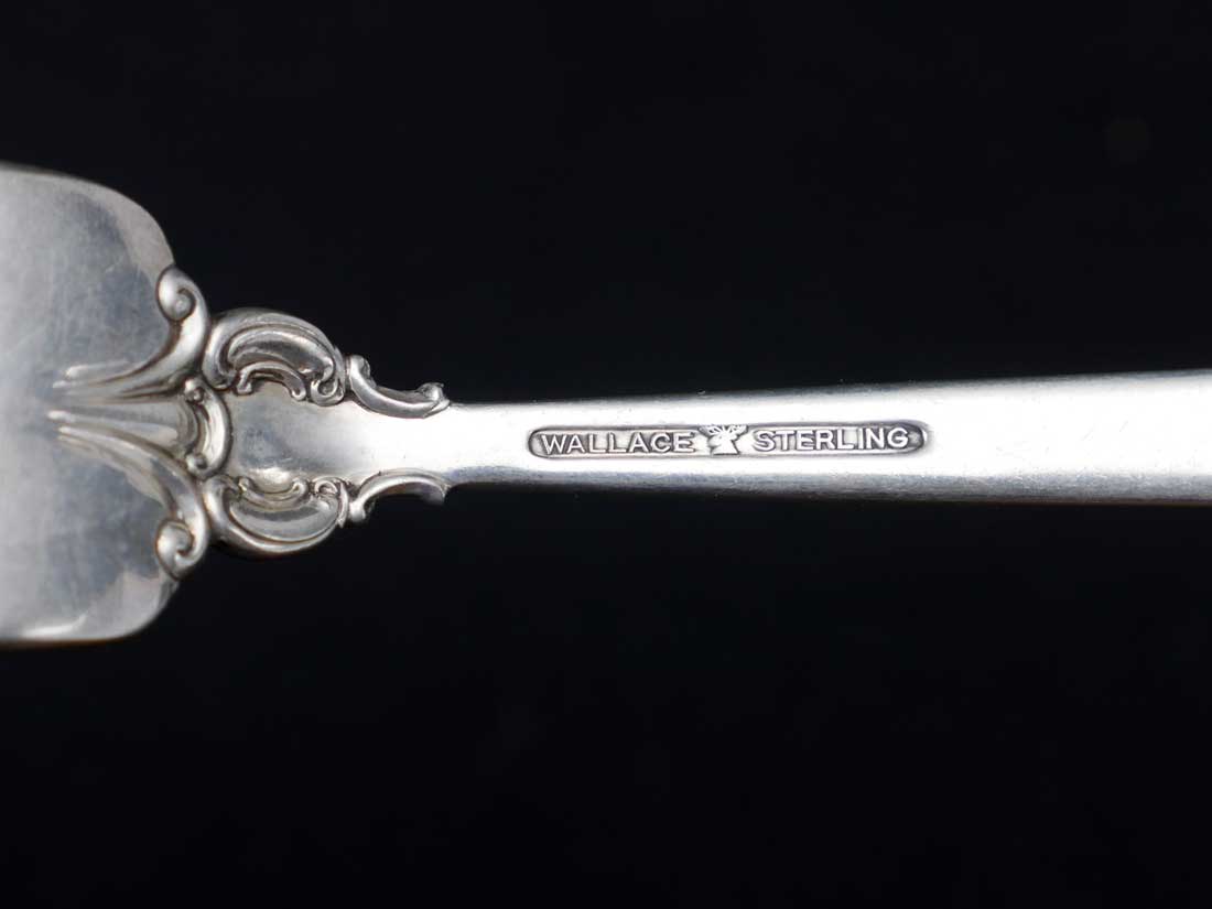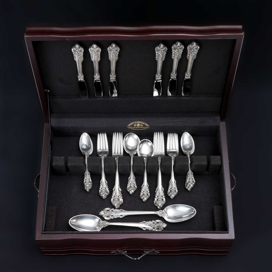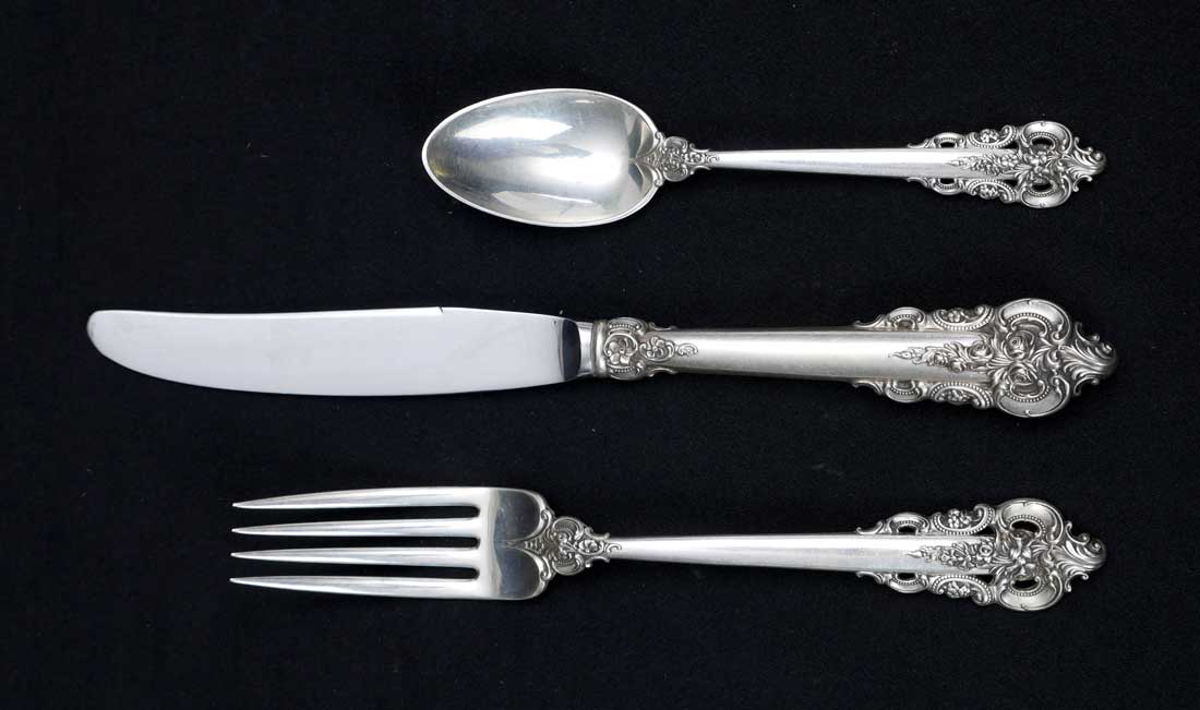 WALLACE GRAND BAROQUE STERLING FLATWARE SERVICE: Approx. 38 pieces in the Grand Baroque pattern by Wallace to include 6 forks (7 1/2''), 6 salad forks (6 1/2''), 12 teaspoons (5 3/4''), 6 soup spoons (6 1/8''), 6 hollow knives (9''), 2 tablespoons (8 3/4''). Approx. 51.2 troy oz.