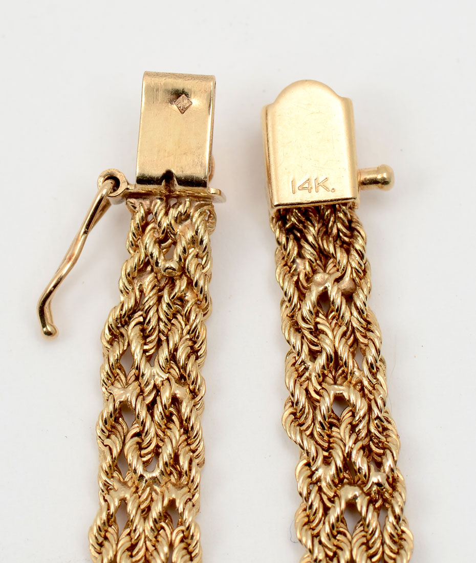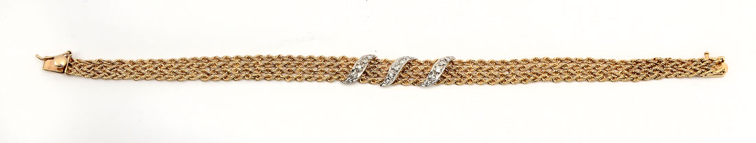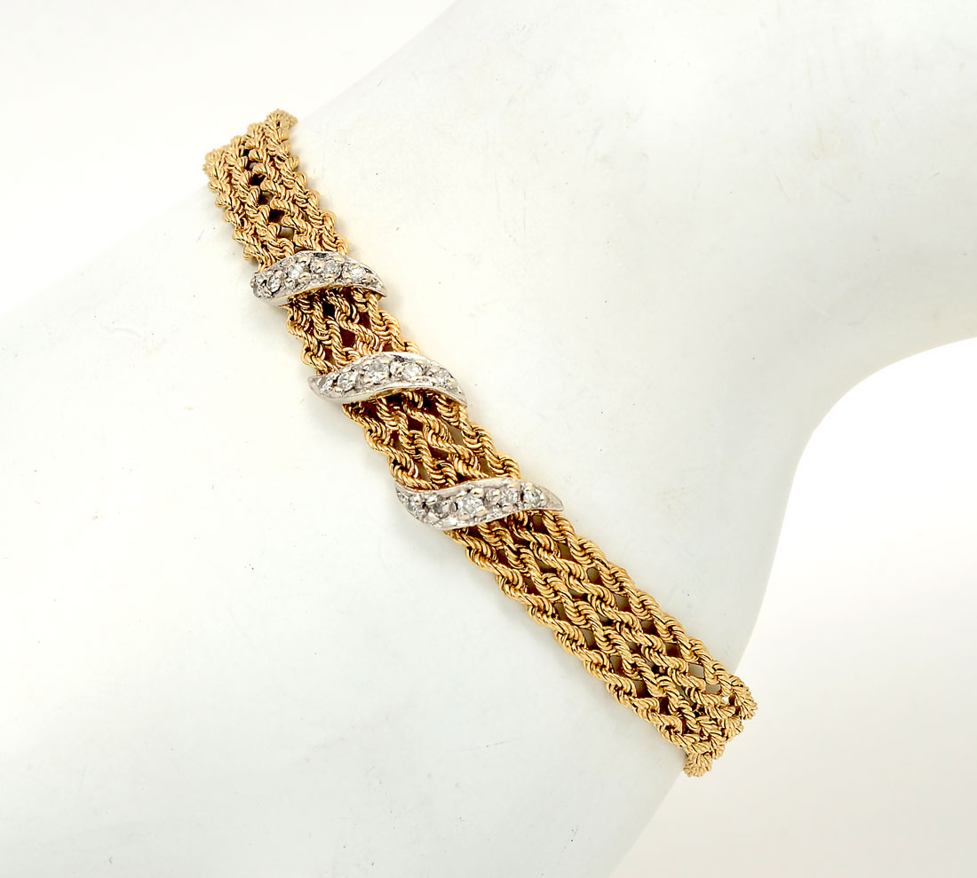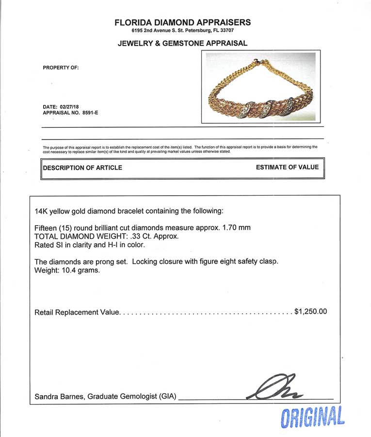 14K & DIAMOND BRACELET: Yellow gold bracelet is 7'' in length and has 3 swirls of (15) diamonds approx .33CTW total. Total weight 10.4 grams. Sold with current Florida Diamond Appraisers GIA graduates appraisal $1250.