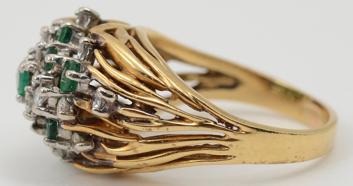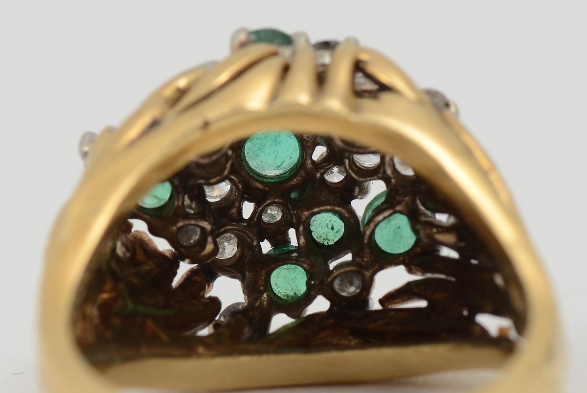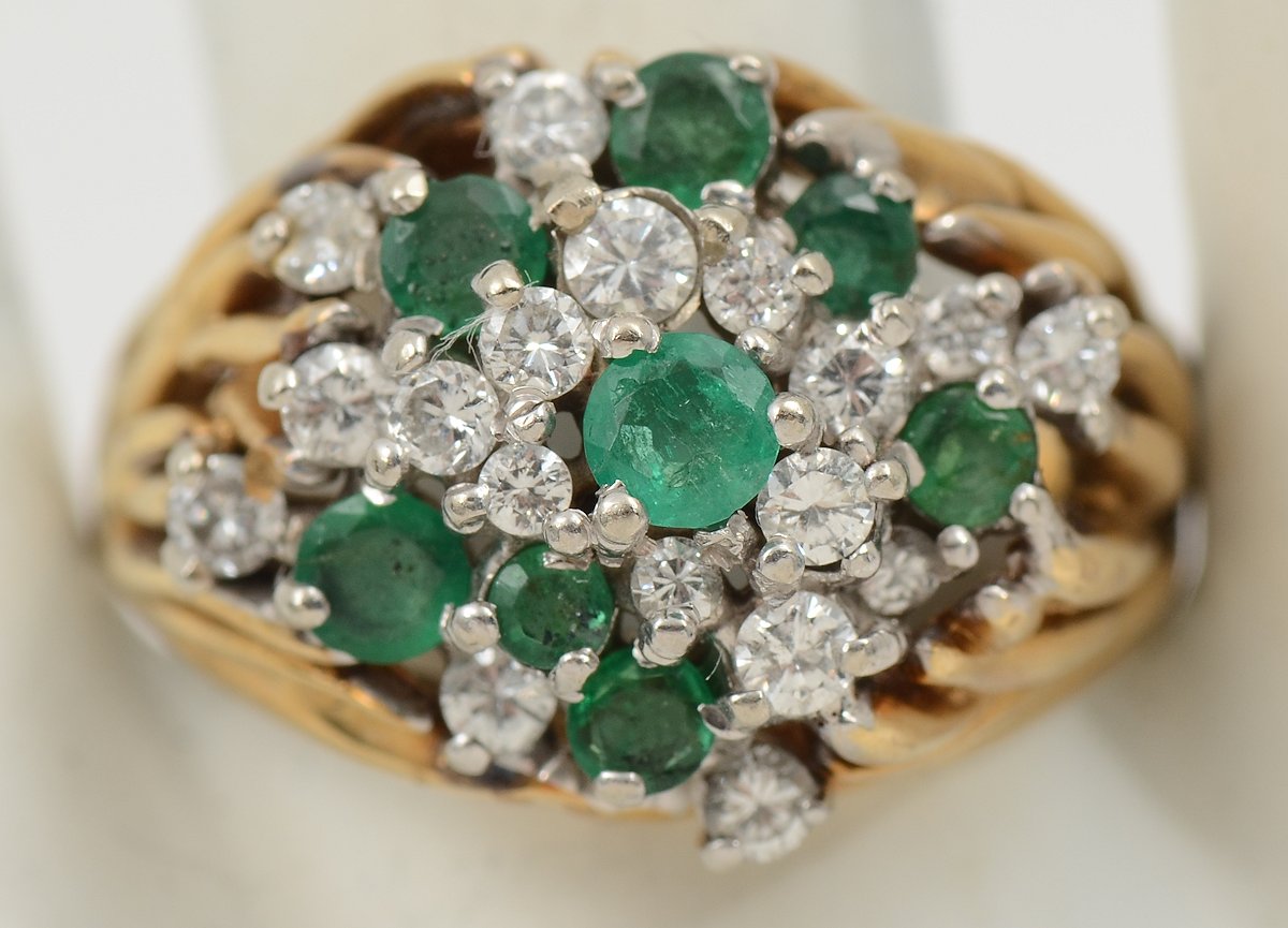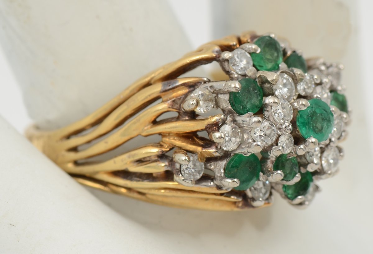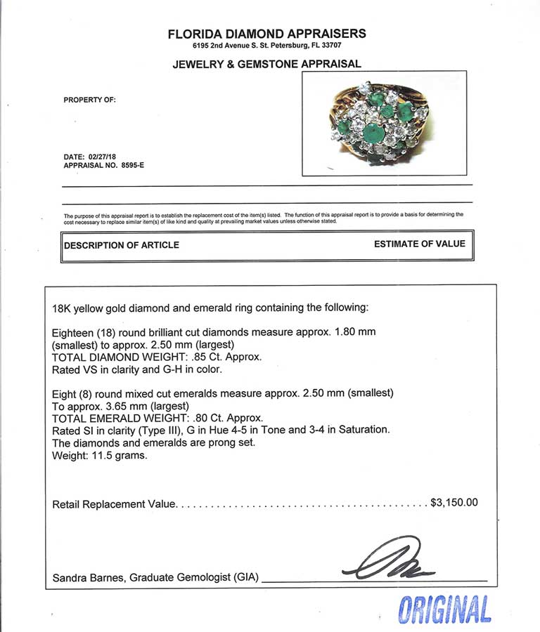 DOMED 18K DIAMOND & EMERALD RING: Yellow gold domed ring features 8 round mixed cut emeralds approx .80 CTW and 18 round brilliant cut diamonds approx .85 CTW in an appealing random pattern. Size 8.5. Weight 11.5 grams. Sold with current Florida Diamond Appraisers GIA graduates appraisal for $3150.