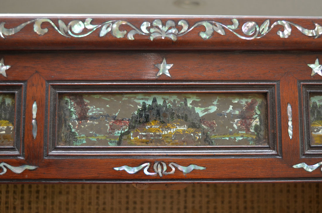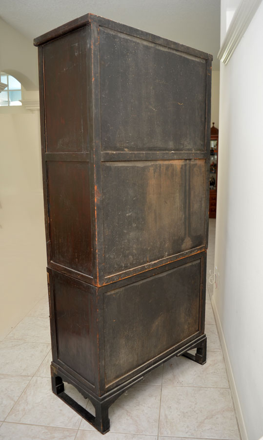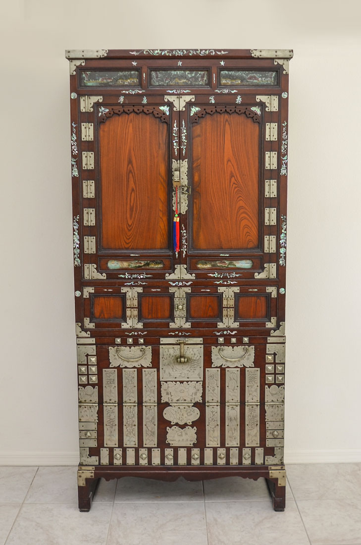 KOREAN MOTHER OF PEARL INLAID TALL CHEST: Late 19th century, Pyung-Yang City, Tiso Story chest, elaborately decorated sandalwood chest with mother of pearl inlay and silver toned mounts. 3 reverse painted windows over 2 doors with interior shelf. 2 center doors open and slide for access to 3 drawers, over drop front door, shaped skirt and legs. Overall 79 1/4'' h. x 37'' x 18 1/2''.