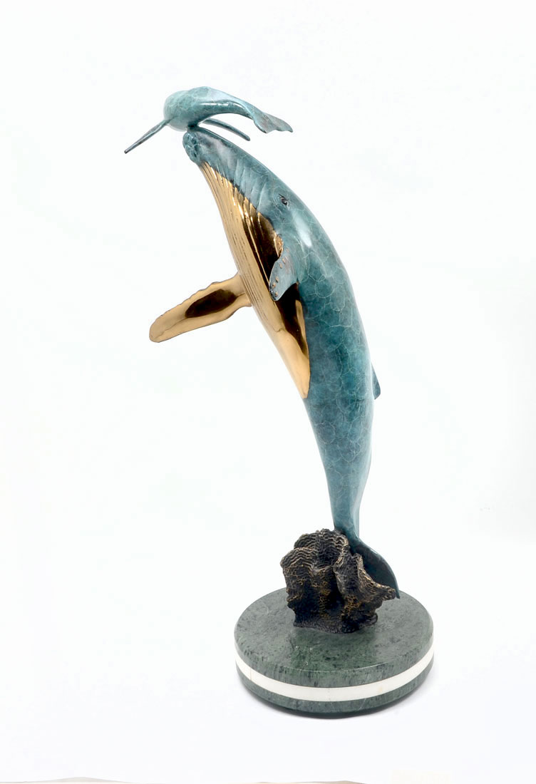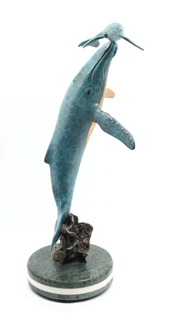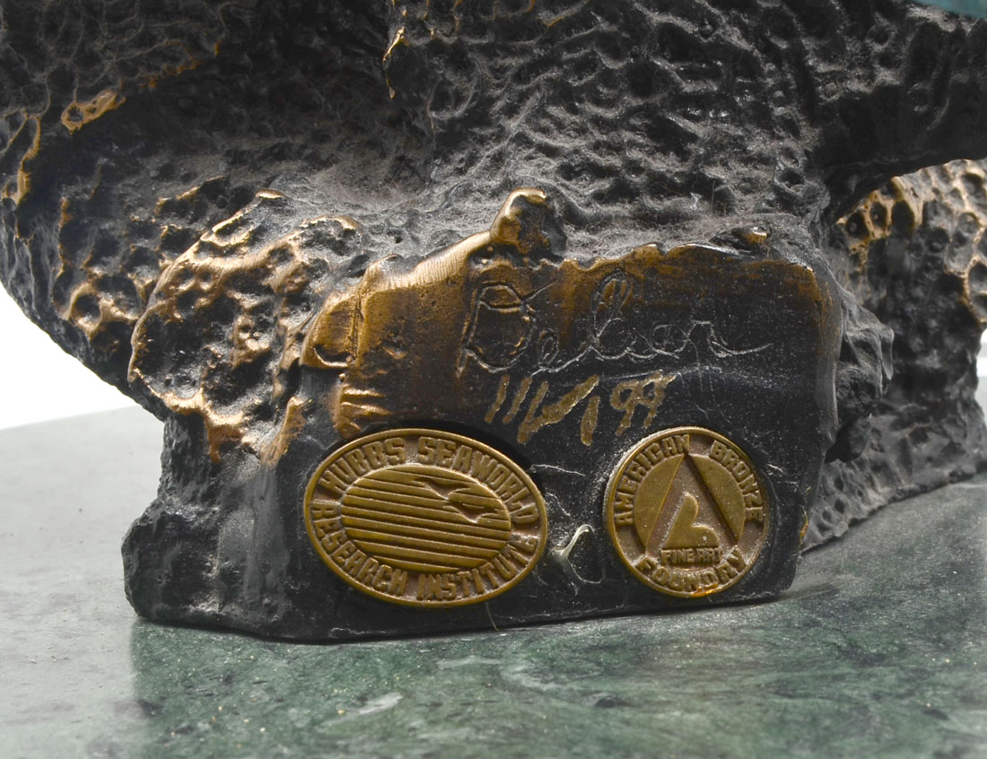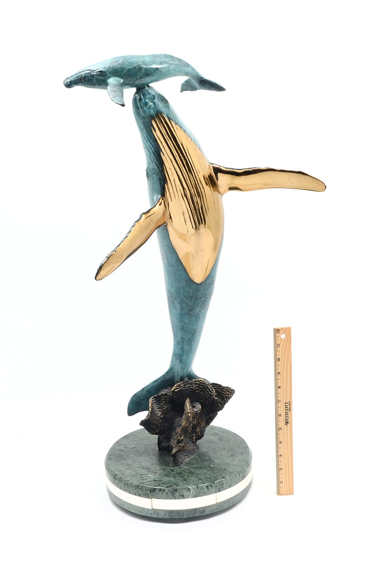 DELIER HUMPBACK WHALE BRONZE SCULPTURE: ''Nurturing Touch'', Patinated Bronze, rotating marble base, 30'' overall, signed and numbered 111/199, American Bronze Fine Art Foundry and Hubbs SeaWorld Research Institute medallions affixed.