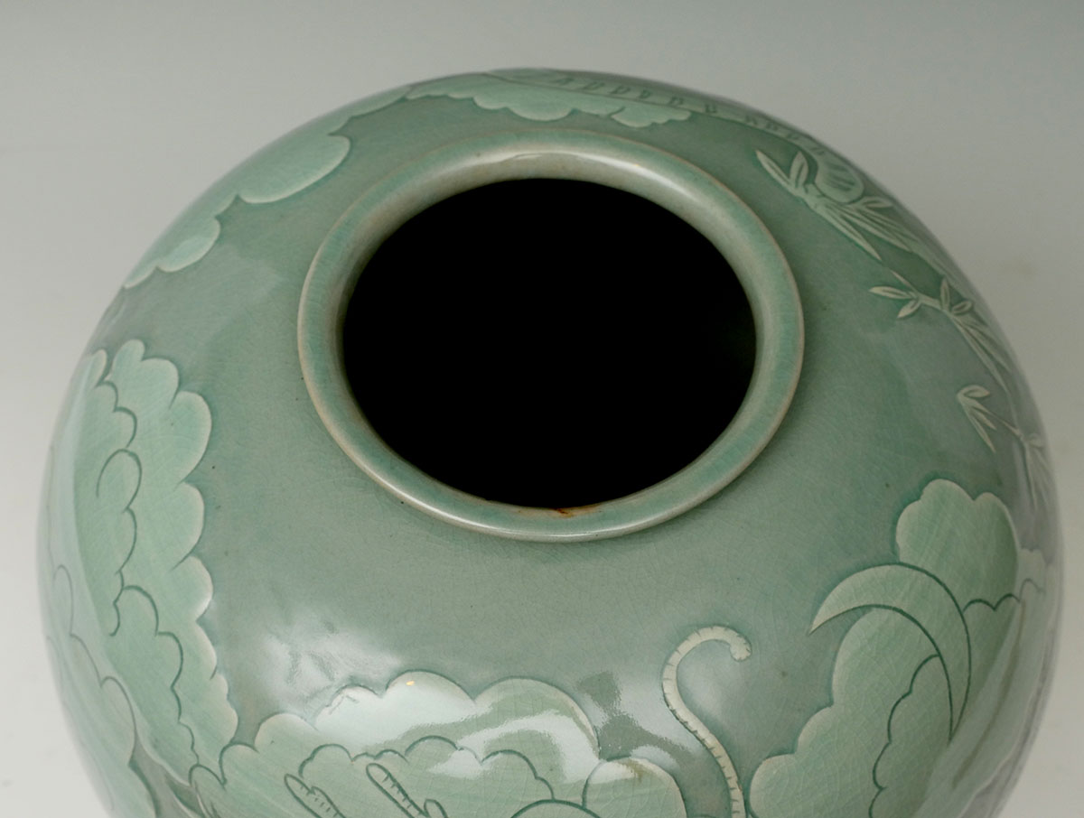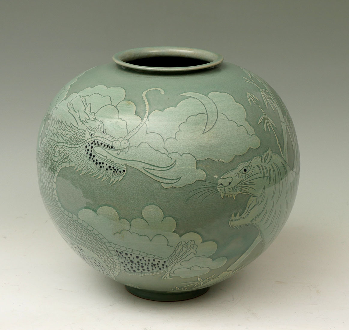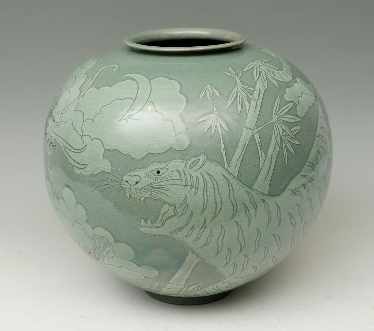 KOREAN CELADON DRAGON AND TIGER JAR: 20th century squat jar or vase, celadon crackle glaze with standoff between figural dragon and tiger, with bamboo shoots and clouds. Signed on base, 13'' h. x 14'' dia.