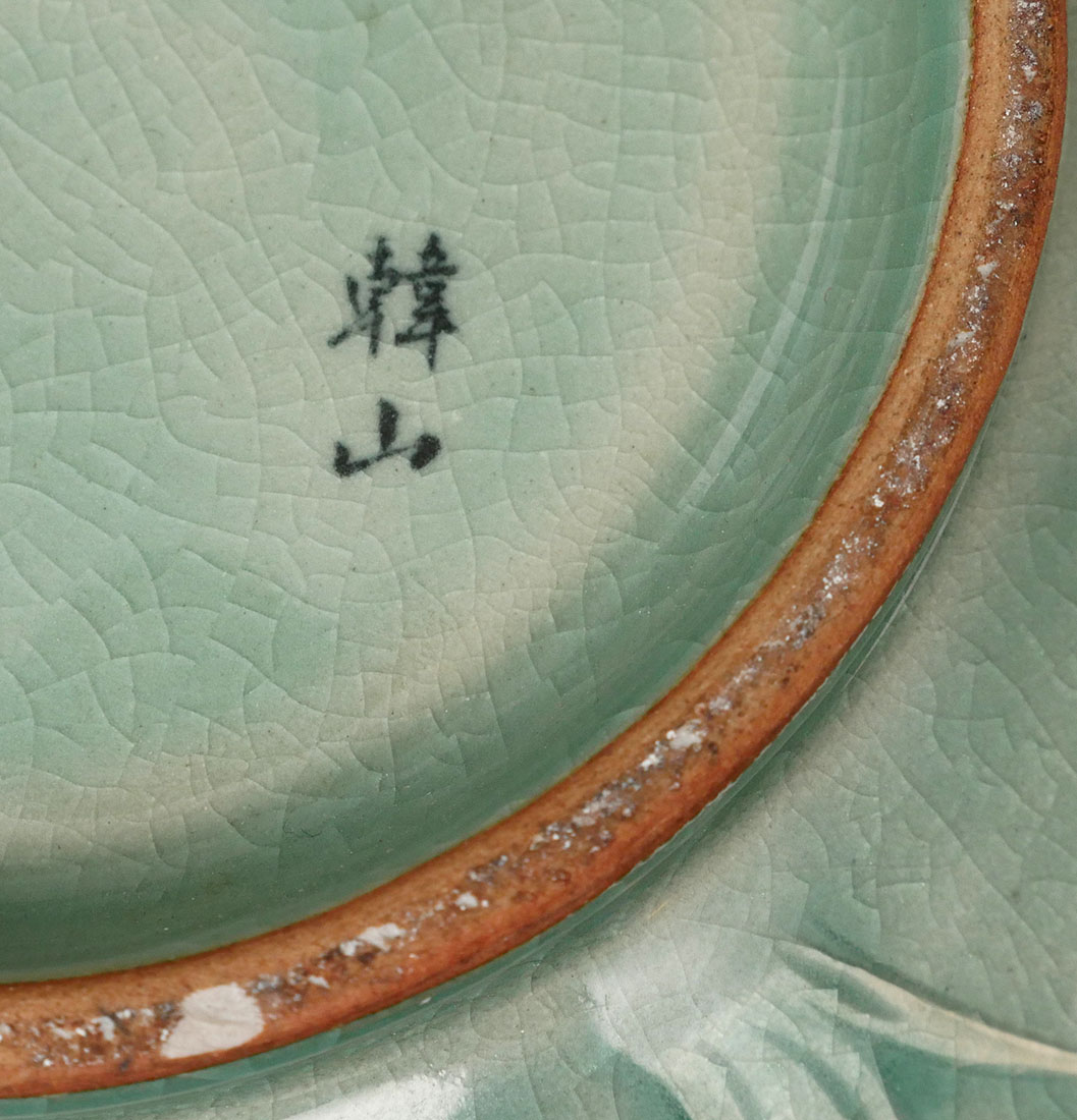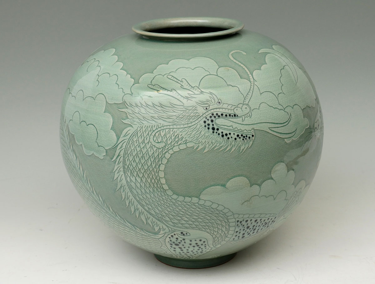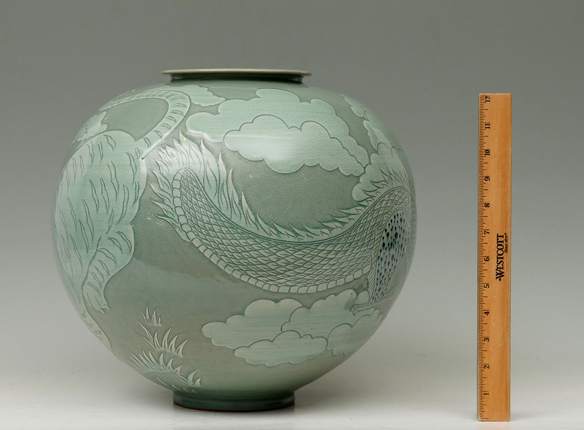 KOREAN CELADON DRAGON AND TIGER JAR: 20th century squat jar or vase, celadon crackle glaze with standoff between figural dragon and tiger, with bamboo shoots and clouds. Signed on base, 13'' h. x 14'' dia.