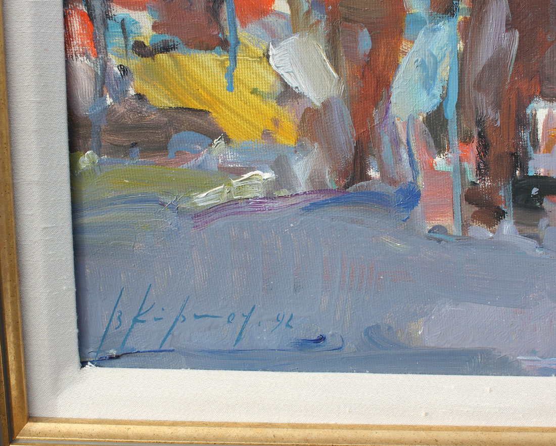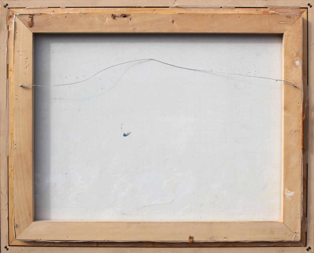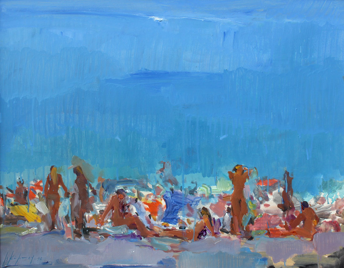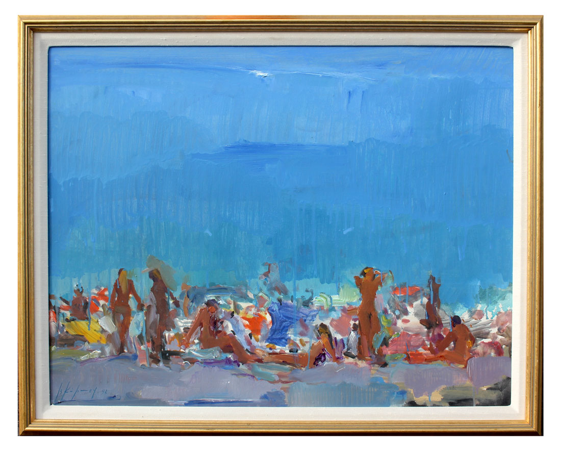 GOOD ILLEGIBLY SIGNED NUDE BEACH PAINTING: Oil/Canvas, sight size is 21.50'' x 27.50'', signed lower left and dated 96', framed 25'' x 31'', stamp verso reads ''National Galleries''.