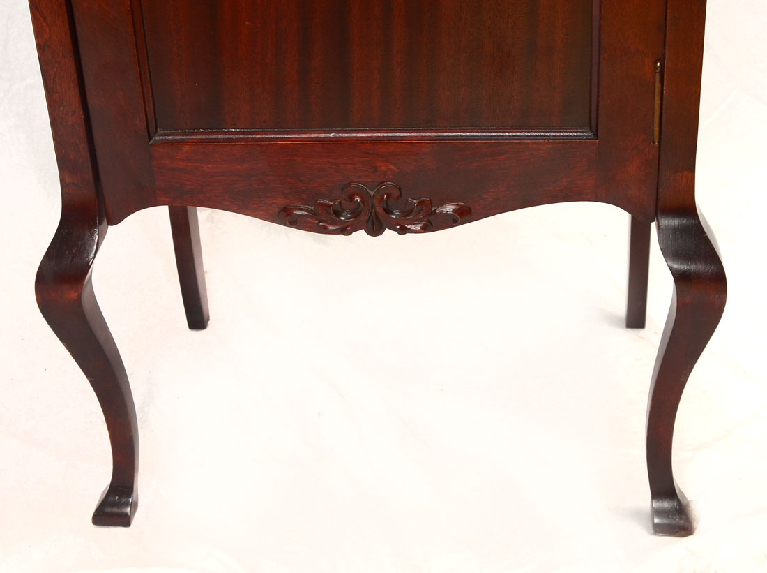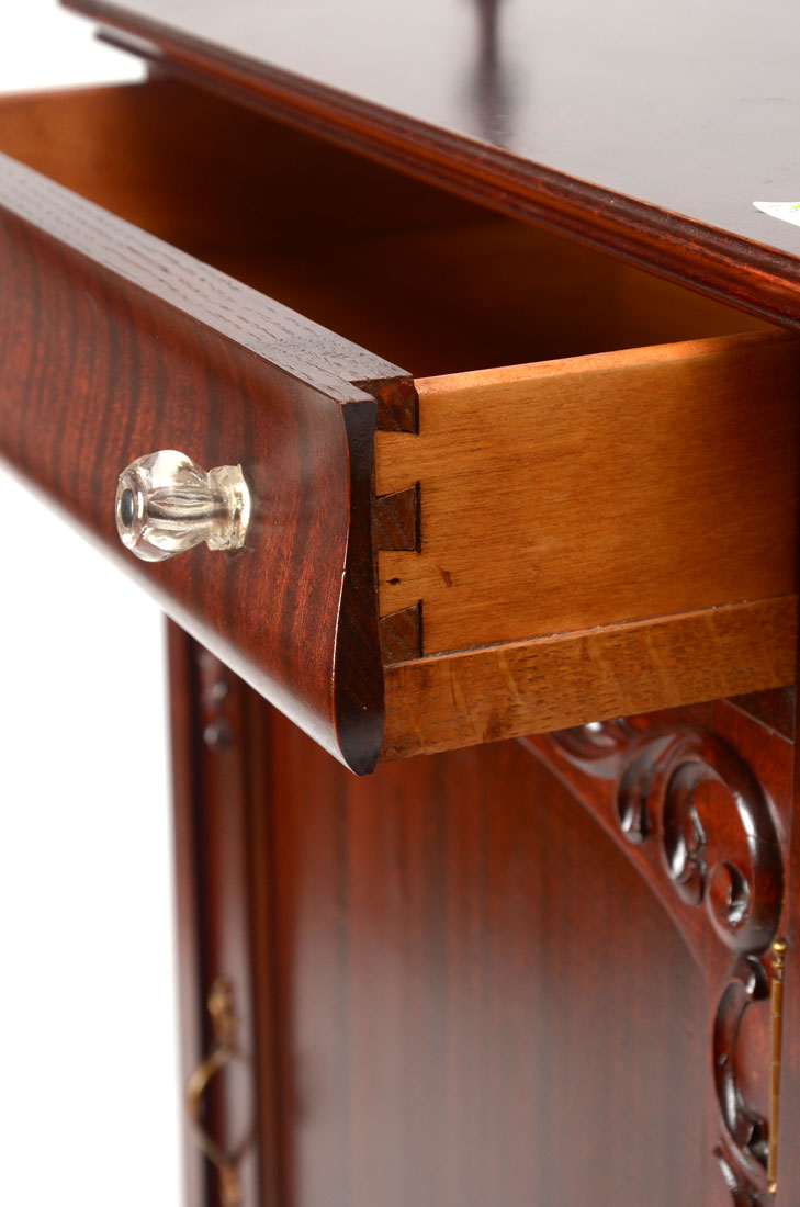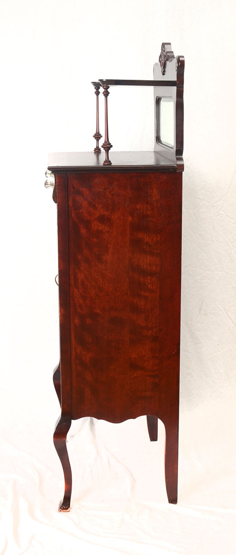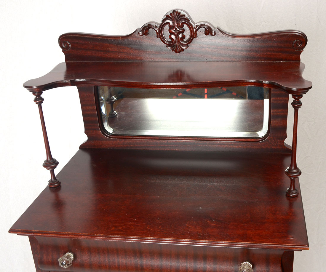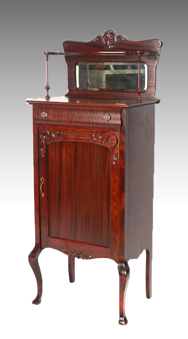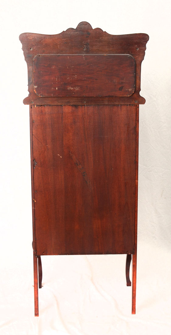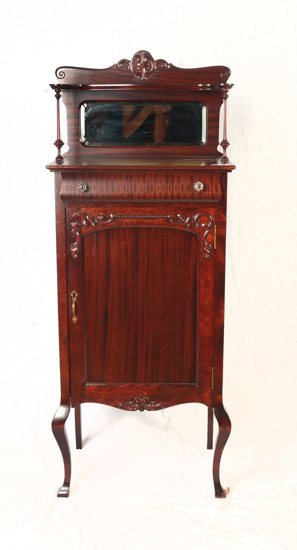 VICTORIAN MAHOGANY SHEET MUSIC CABINET: Sheet Music Mahogany Cabinet with glass handled drawer, beveled mirror back inset below upper exterior shelf, locking cabinet with 6 internal shelves. Approx. 52'' h x 20.75'' l x 14'' w.